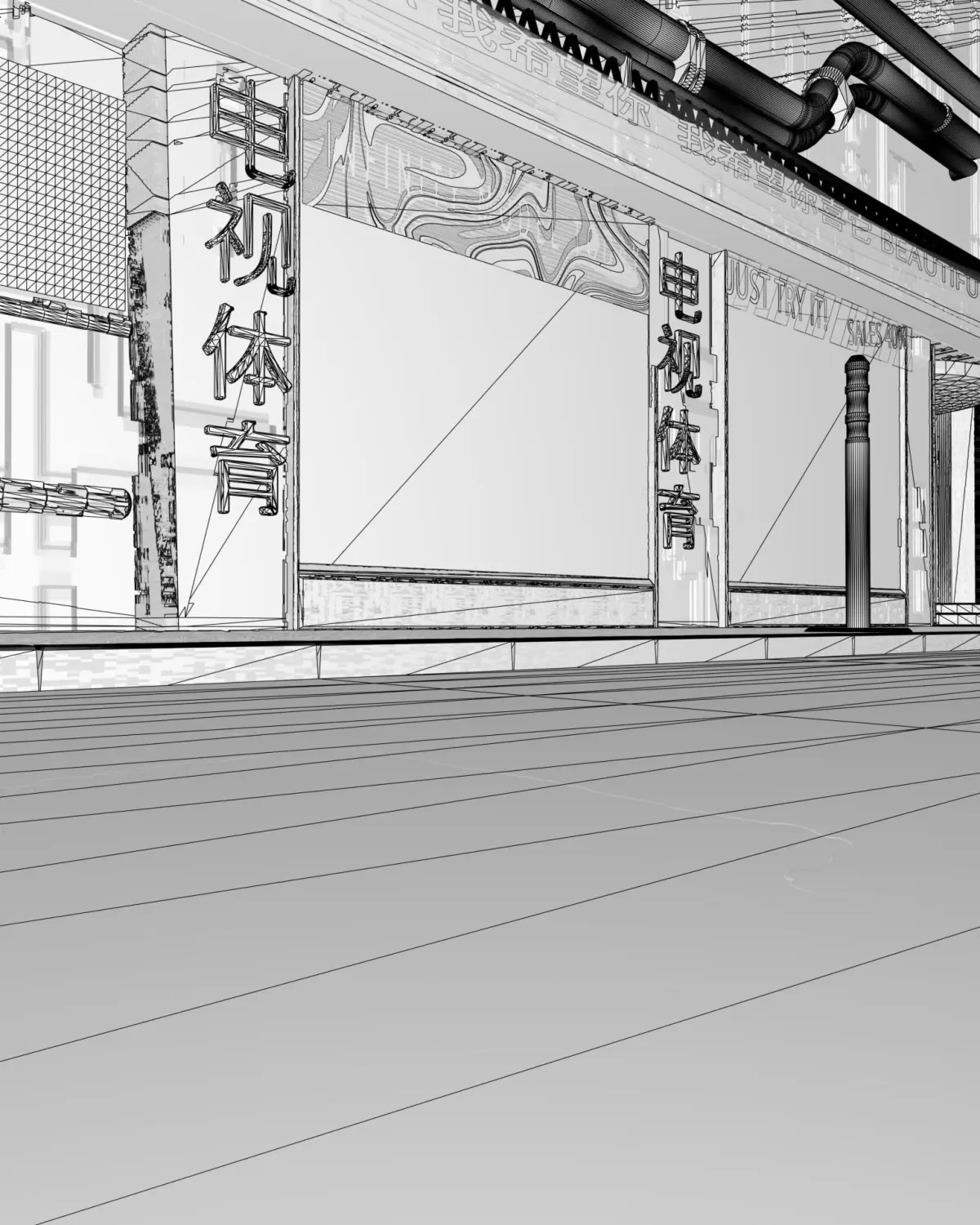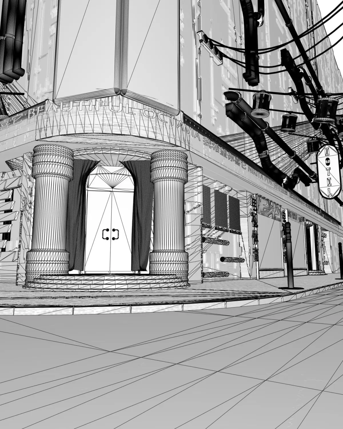 In file you can find a full composition, like on the picture, with textures in c4d file with octane render. Also a 3d object, like on the pictures, they are can be useful. In folder with 3d models you can find a pictures, and obj files for this pictures. There are lot of useful stuff, suck as barriers, bilboards, shops (cinema enter has a statues and curtains, wich can be useful too), fittings, wires and other. Every store is presented as a block, so you can use them in modeling of buildings, of you can took different elements from there, such as statue of human, laptos, or showcases.Every obj has a texture, but read attentively, every obj also has a poligons with textures to facilitate the work with them.