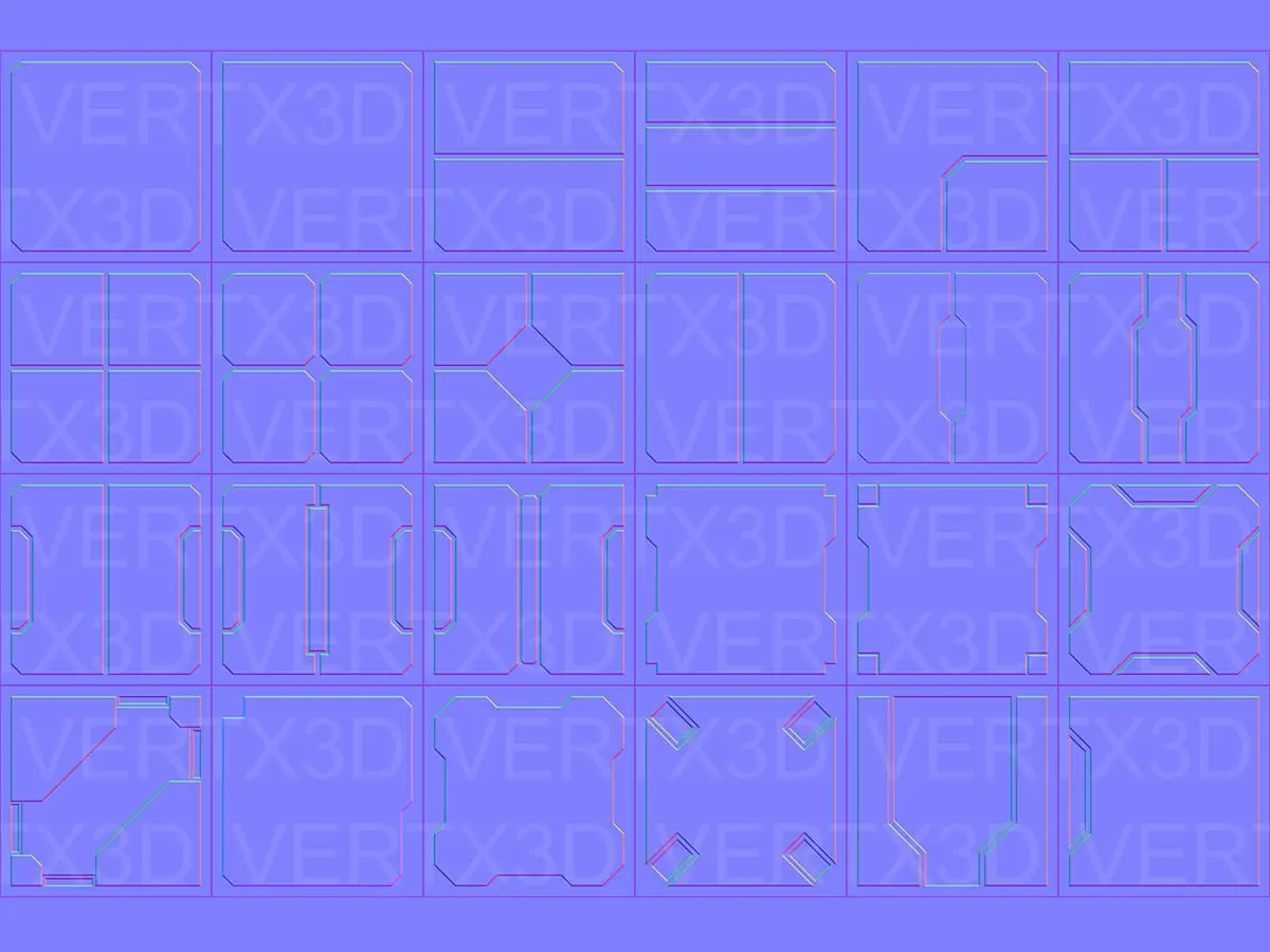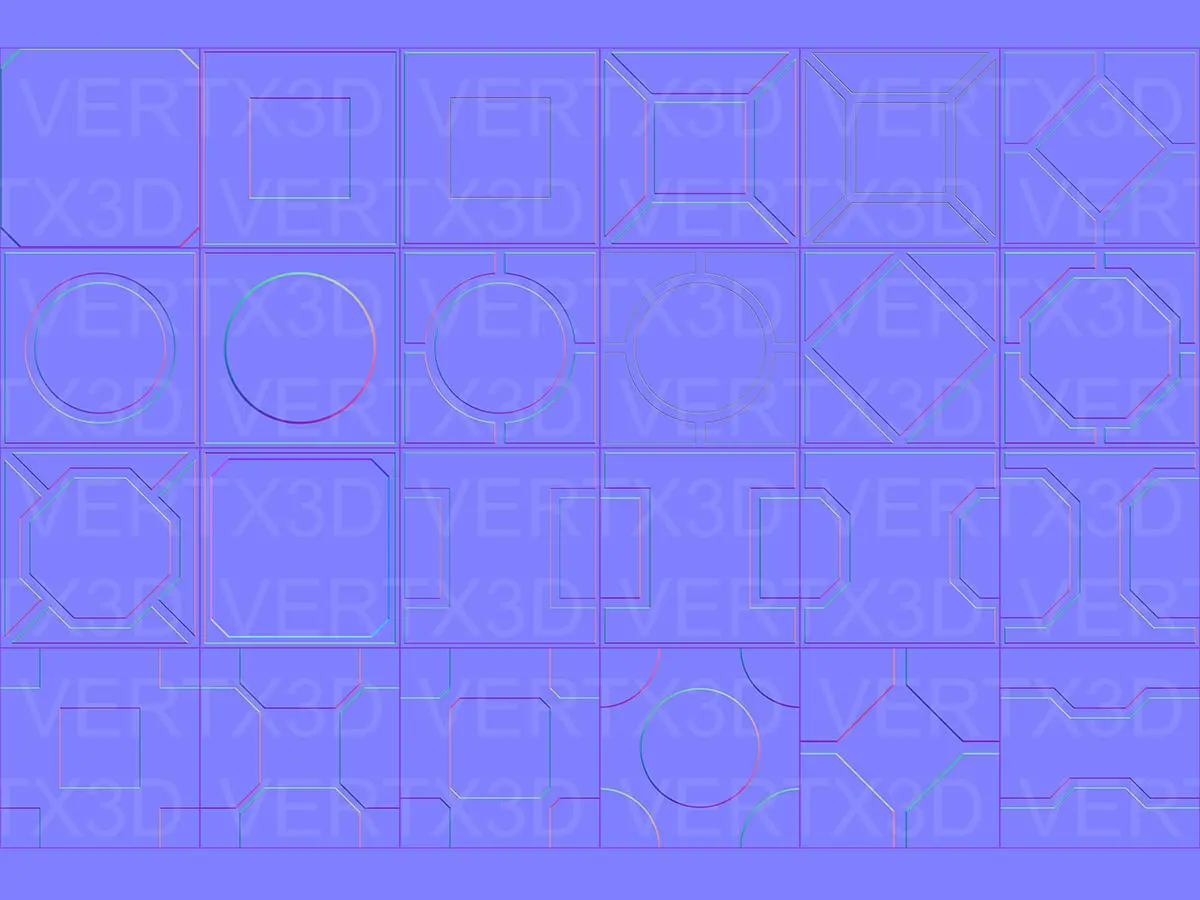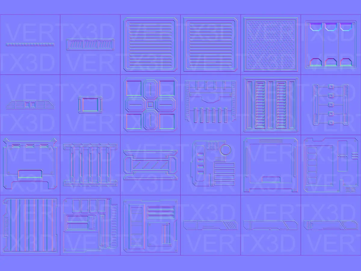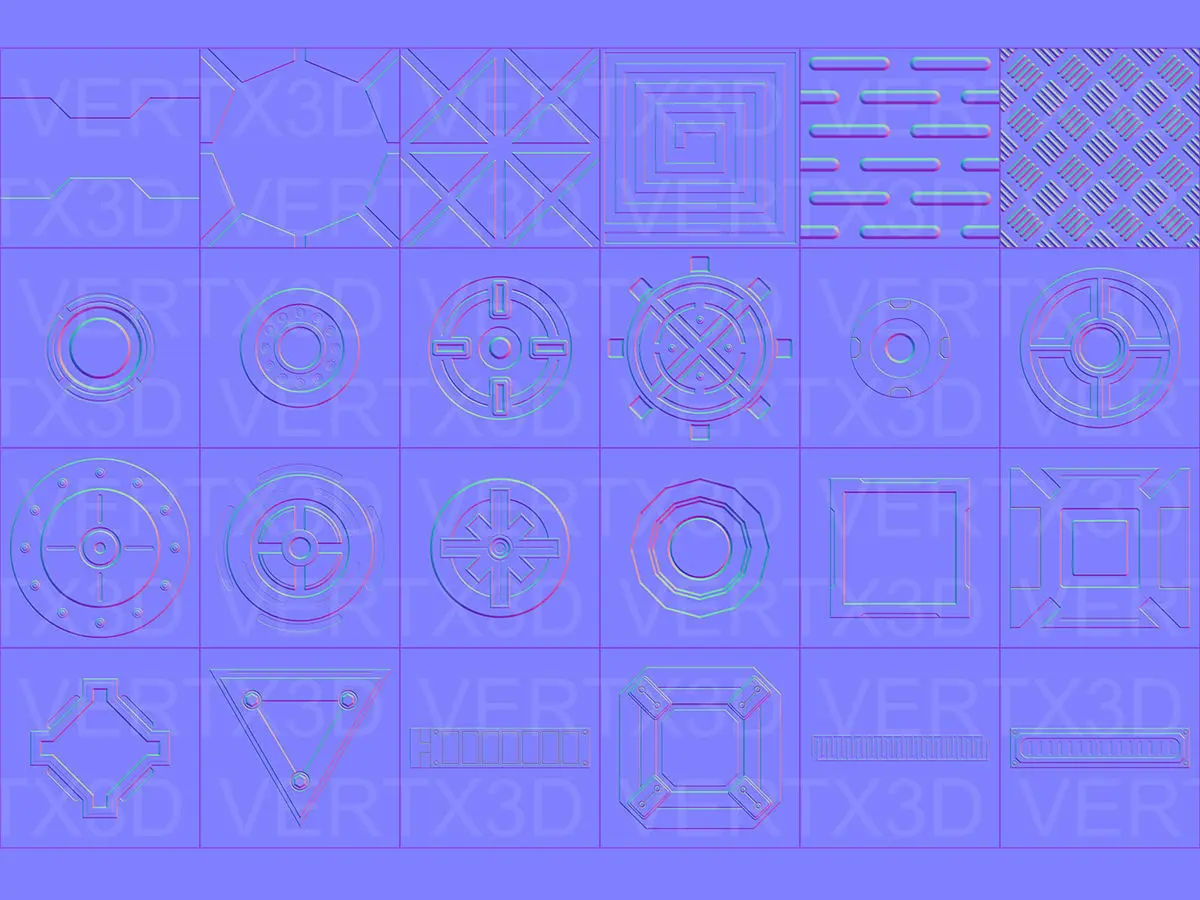 Over 100 normal maps divided in three groups: Seamless patterns, Panels and Various details.