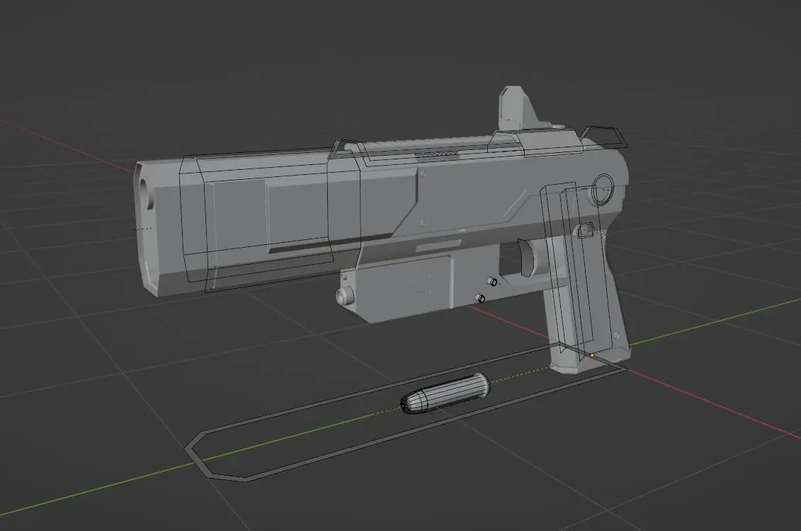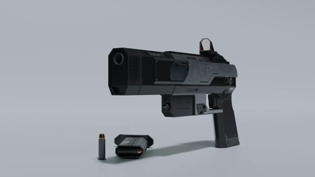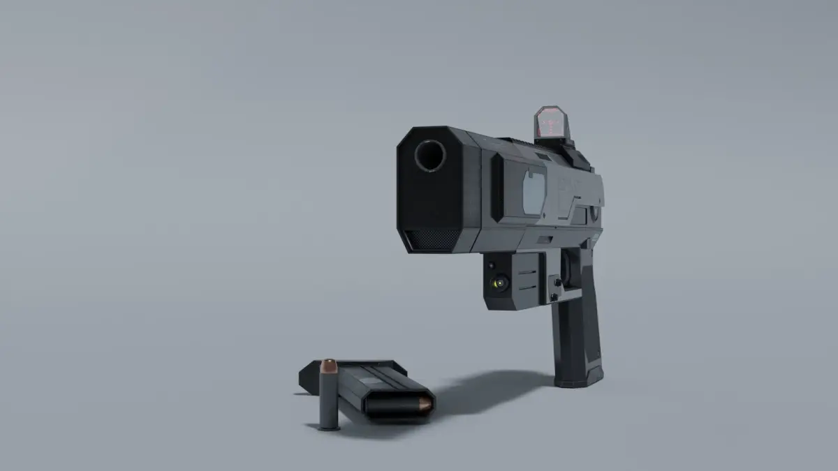 Concept of a large-caliber semi-automatic sci-fi pistol with a silencer, optics, built-in flashlight and laser designator for .357 magnum caliber. Created in Blender 3.6