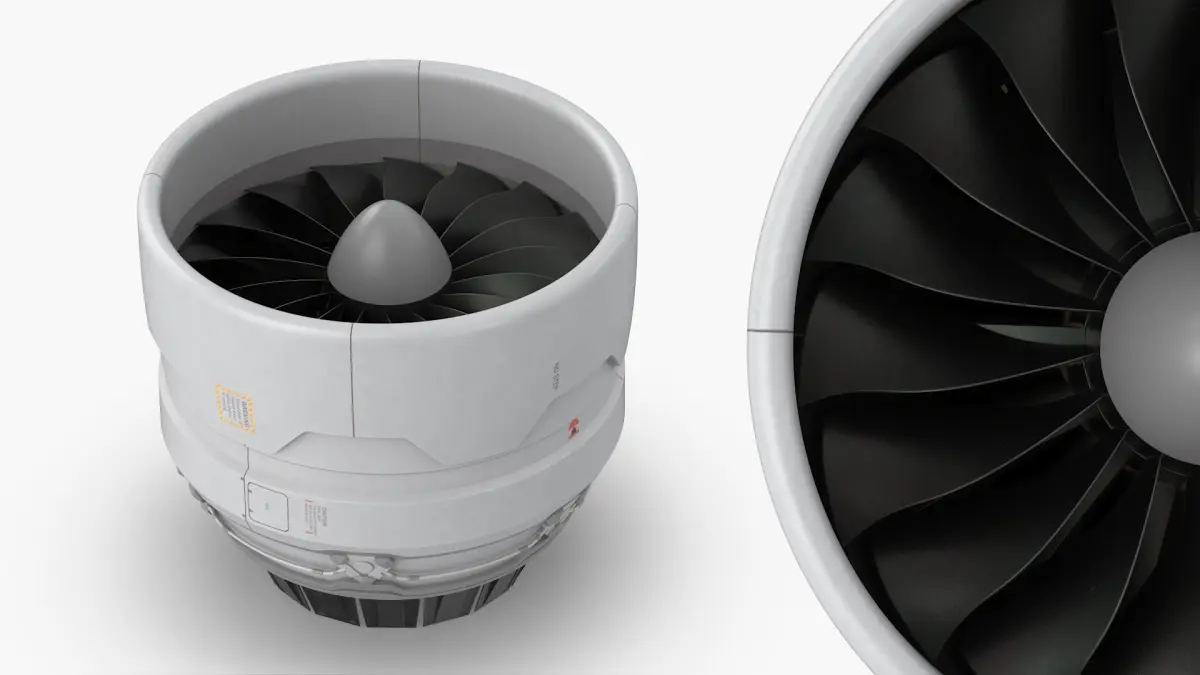 The model features a sleek white exterior housing with aerodynamic contours and precise panel lines. Inside, a set of highly detailed black turbine blades is arranged within a wide intake cone, suggesting high thrust capacity. Subtle surface markings such as “NO STEP” and functional access panels add authenticity to the industrial sci-fi design.