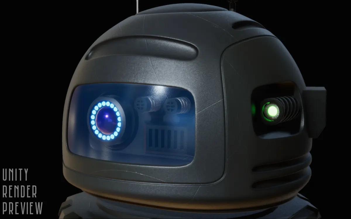 A 3D model of a sci-fi robot / droid created in Blender.