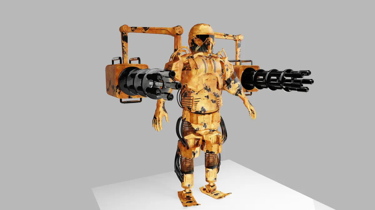 A high-poly sci-fi robot soldier designed for cinematic scenes, futuristic battles, and high-end game environments. This character features a rugged exoskeleton with dual heavy rotary cannons mounted via mechanical arms, delivering a powerful and intimidating look.The model comes fully UV unwrapped (non-overlapping) with a single 4K PBR texture set including normal maps for detailed surface definition. Ideal for showcasing in next-gen sci-fi games, trailers, or concept art.