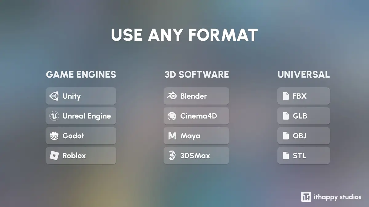 FILESYou’ll be able to download formats such as Unity Package, UE, Blender, C4D, Maya, 3DSMax, FBX, OBJ, GLTF, and STL.