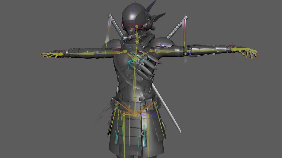 Sci-fi Samurai Ninja 3D CG model rigged character with opening and closing helmet visor, moveable antennas, knifes, sword, belt bags, samurai plated skirt models + 4K textures. This is a Qualitative 3d model othat can be used in Animation/Films/Games.