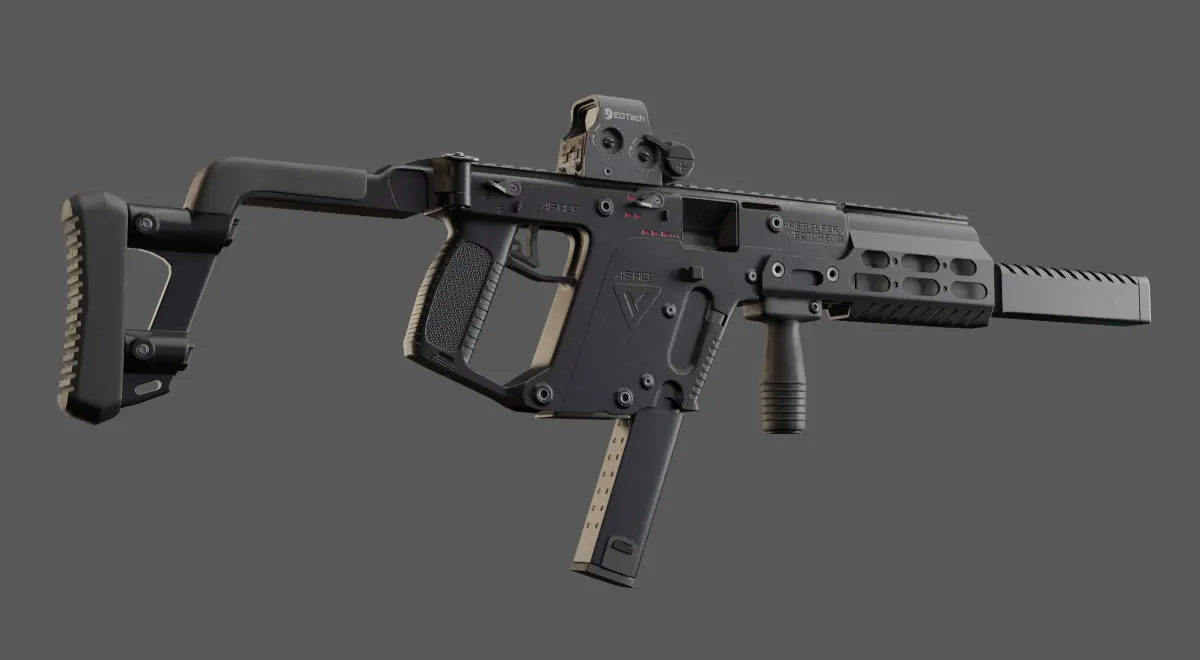 Automatic machine: Detailed 3D model, Vector SMG with a collimator sight, with a magazine, and a reloading handle, but without internal elements.
