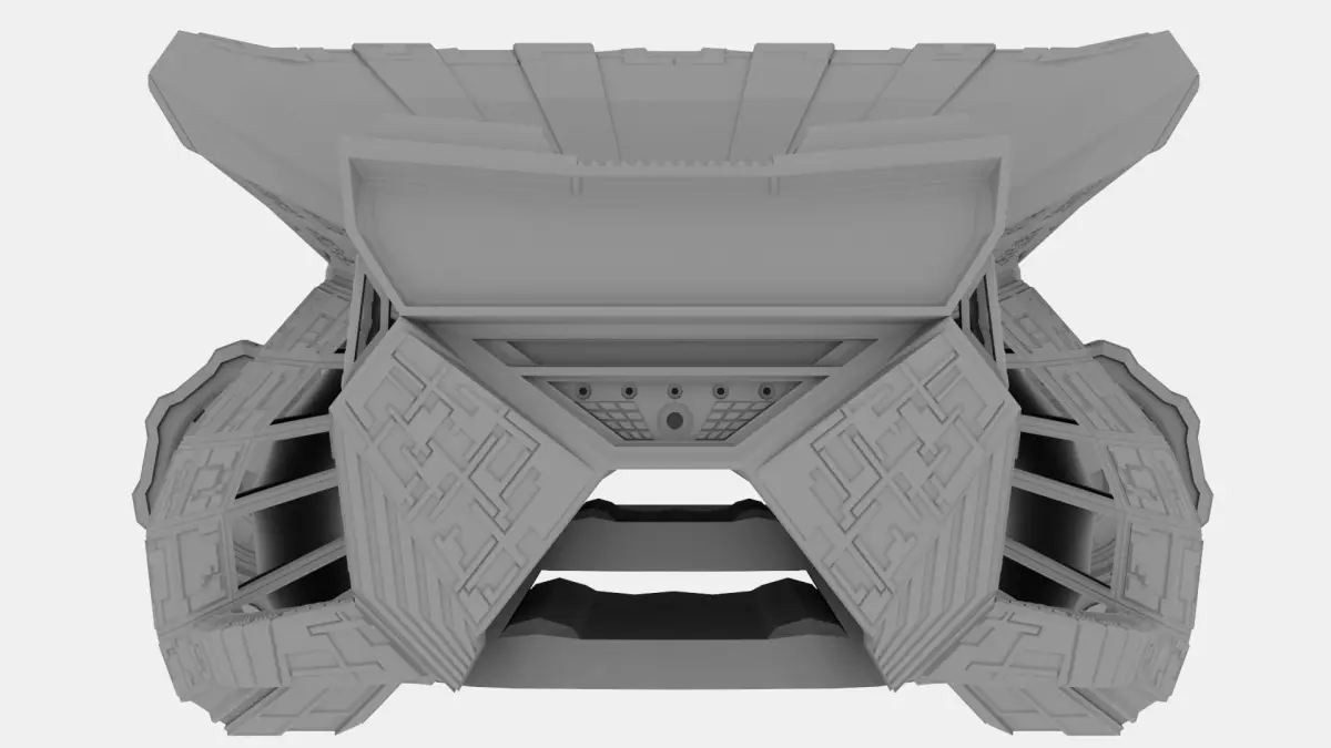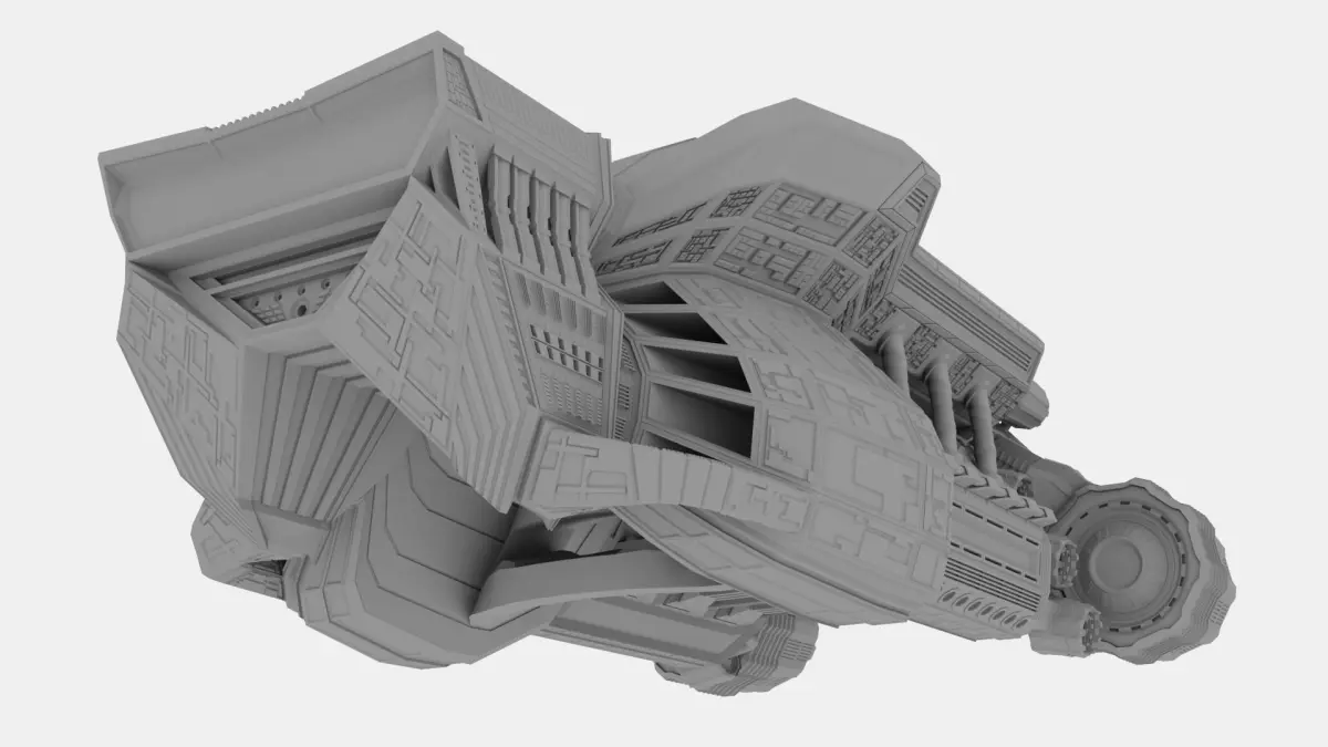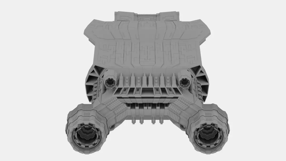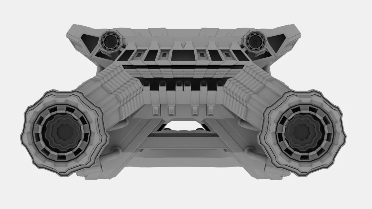 This model is a medium-class spaceship designed for quiet flights, to carry cargo, people, equipment. The ship is equipped with two powerful turbines, which allows it to gain powerful speed during emergencies, as well as 3 turbines on each side of the ship, for maneuvering. This model has no textures and no light sources.