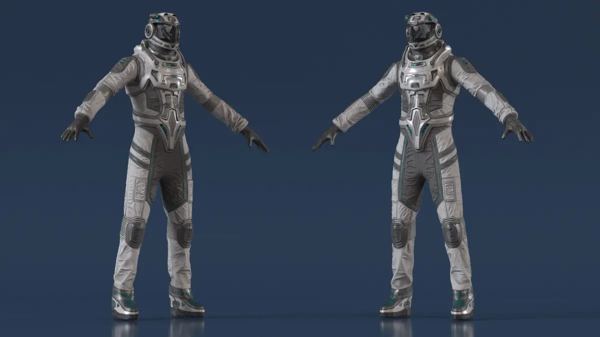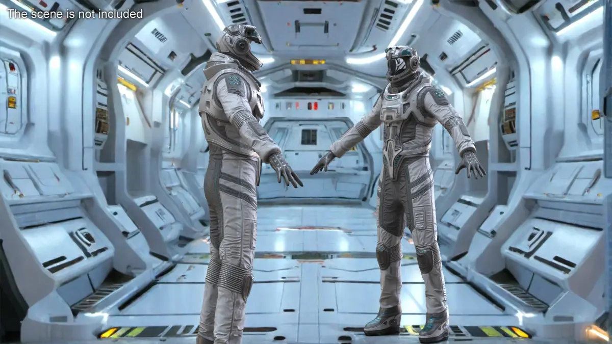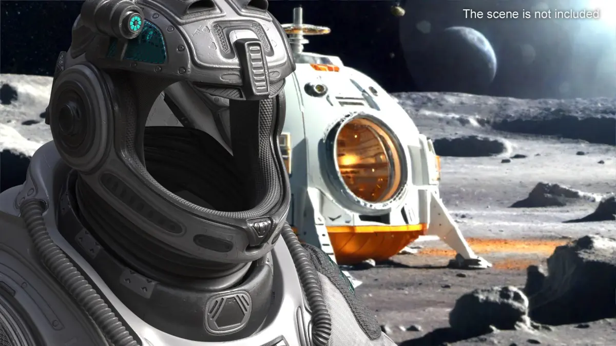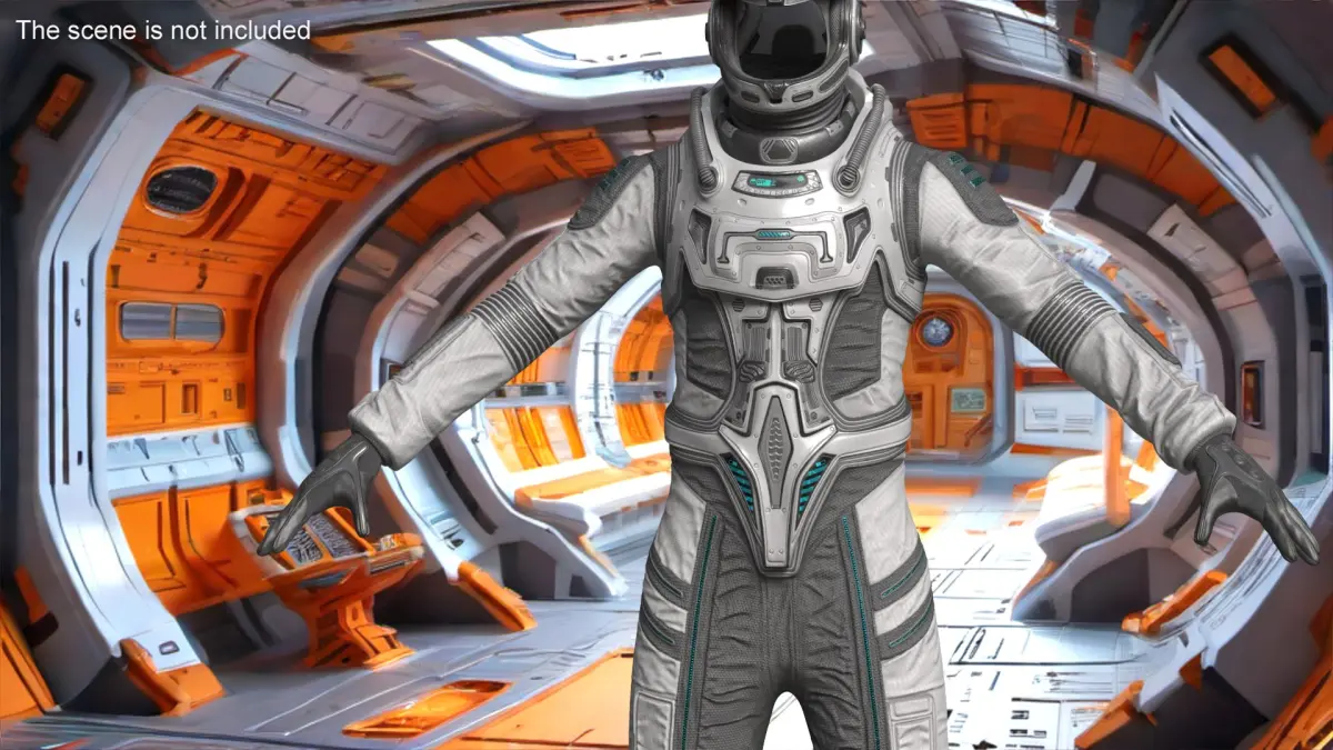 A sci-fi futuristic astronaut spacesuit is a high-tech protective suit designed for space travel in science fiction settings. Often sleek and advanced in appearance, it typically includes life-support systems, radiation shielding, and enhanced mobility features. Such suits are depicted as offering safety and functionality for space exploration in hostile or unknown environments.
