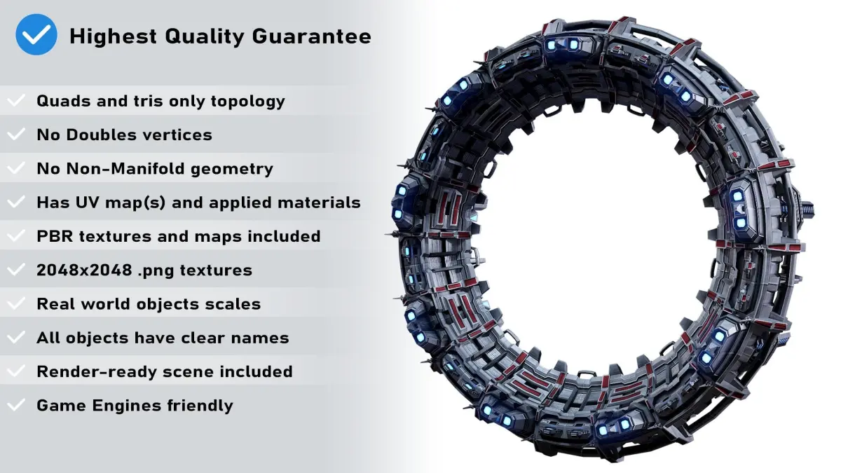 High quality, super realistic, render and game ready model of the Sci-Fi Stargate. The model was created with the highest quality standards: