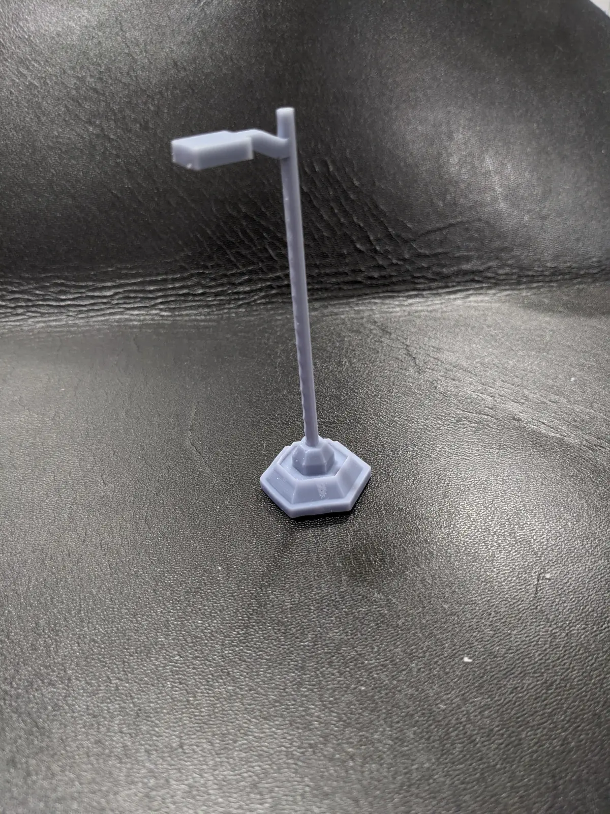 Sci Fi Terrain pack for miniatures gaming featuring a street lamp, signal lights, a crate, and a barrel. Best printed in resin.
