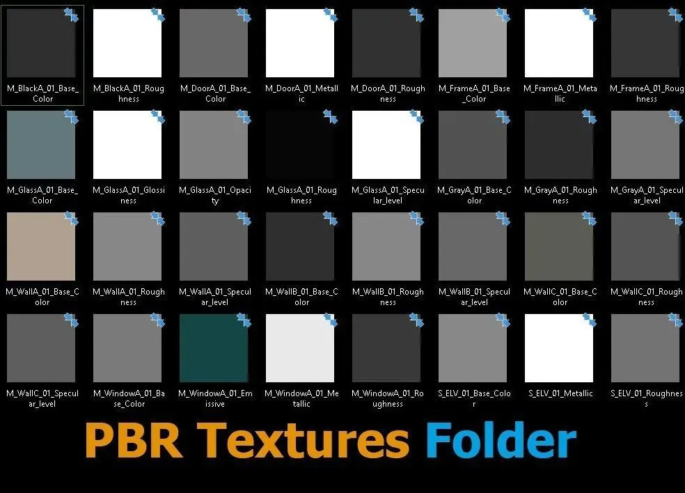 Update 1.0 : I added solid PBR texures as material guidelines . for example: M _WallA _01 _Roughness.PNG 512x512 ( You can add textures into the materials slots ) . PBR names are the same as its material .