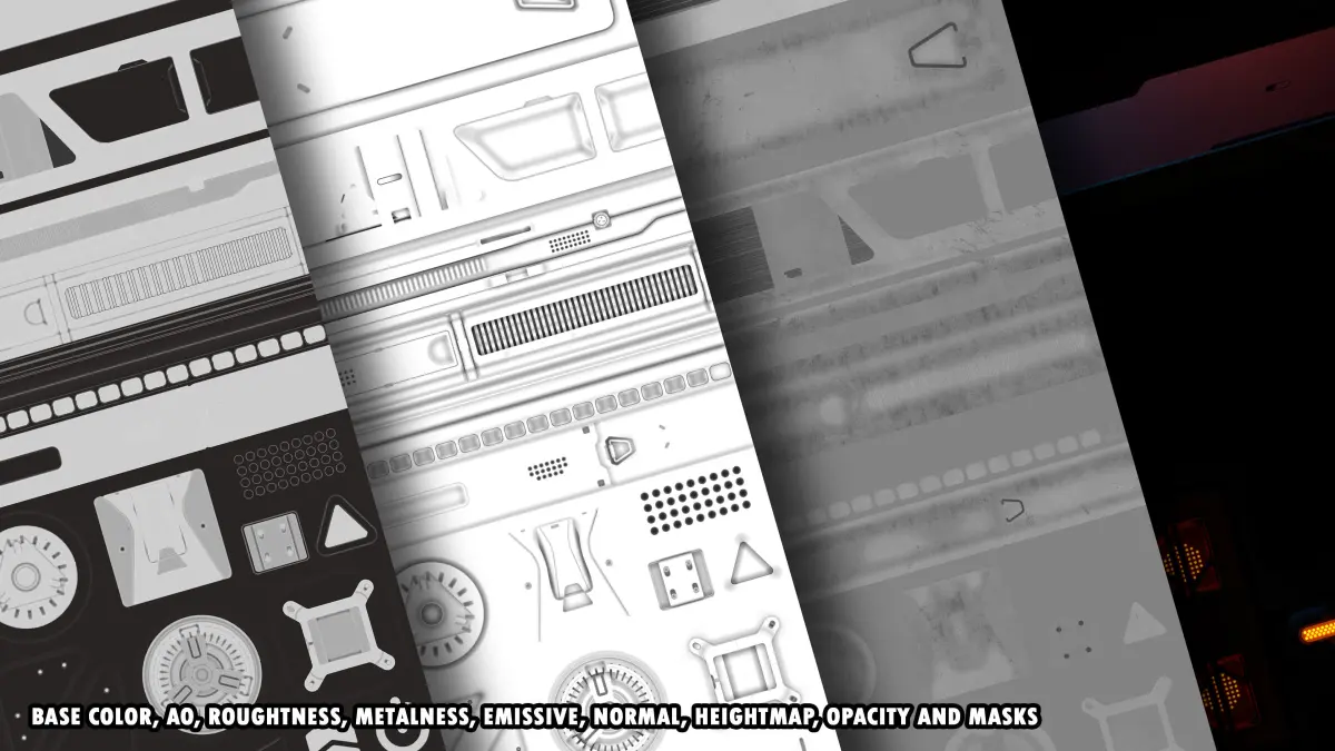 1x4k Base Color texture with neutral grays for easy masking and color customizing1x4k Roughtness texture1x4k Metalness texture1x4k 16 bit heightmap texture1x4k Emissive texture1x4k Normal texture1x4k Packed mask texture with 3 subsets (Opacity, subset A and B)1x4k PSD file with mask1x4k Ambient Occlusion texture