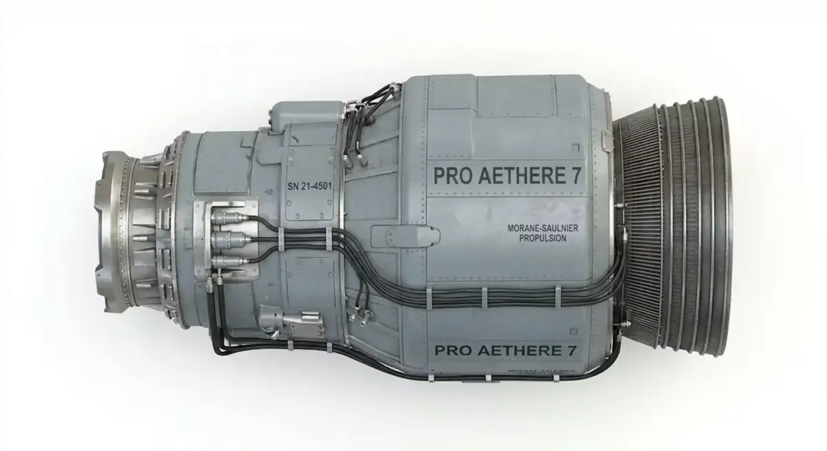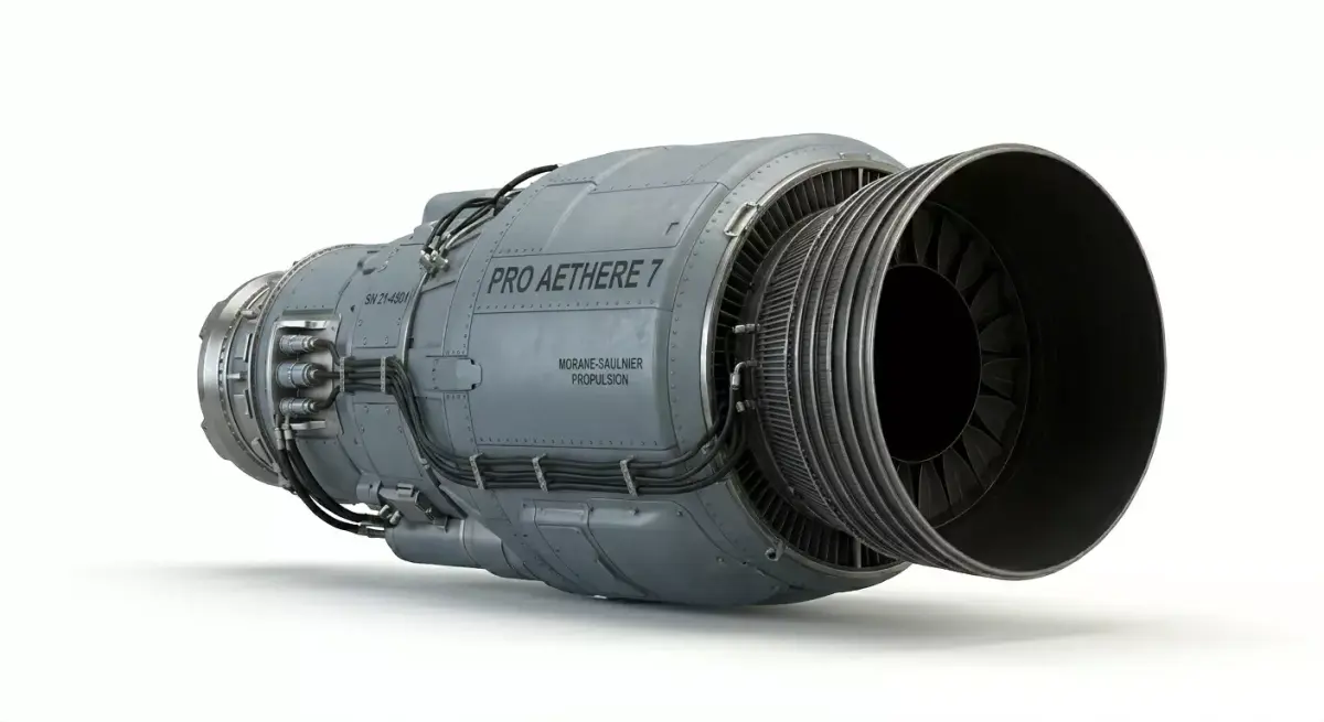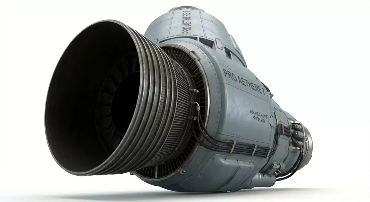 A high-fidelity 3D model of a futuristic aerospace propulsion system, featuring realistic mechanical detailing and textures. The asset showcases a matte grey industrial finish with weathered paneling, exposed wiring harnesses, and intricate turbine blade structures within the nozzle. Labeled with PRO AETHERE 7 and Morane-Saulnier Propulsion, this render is ideal for sci-fi environments, aeronautical simulations, and mechanical engineering visualizations.