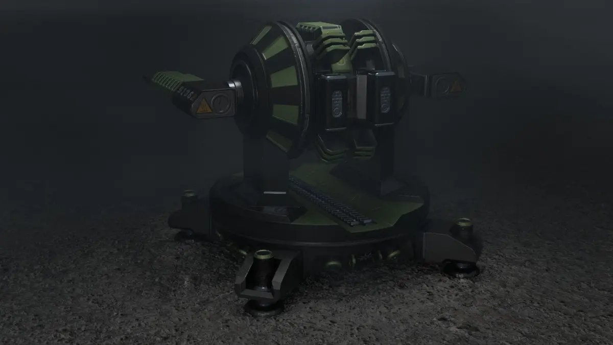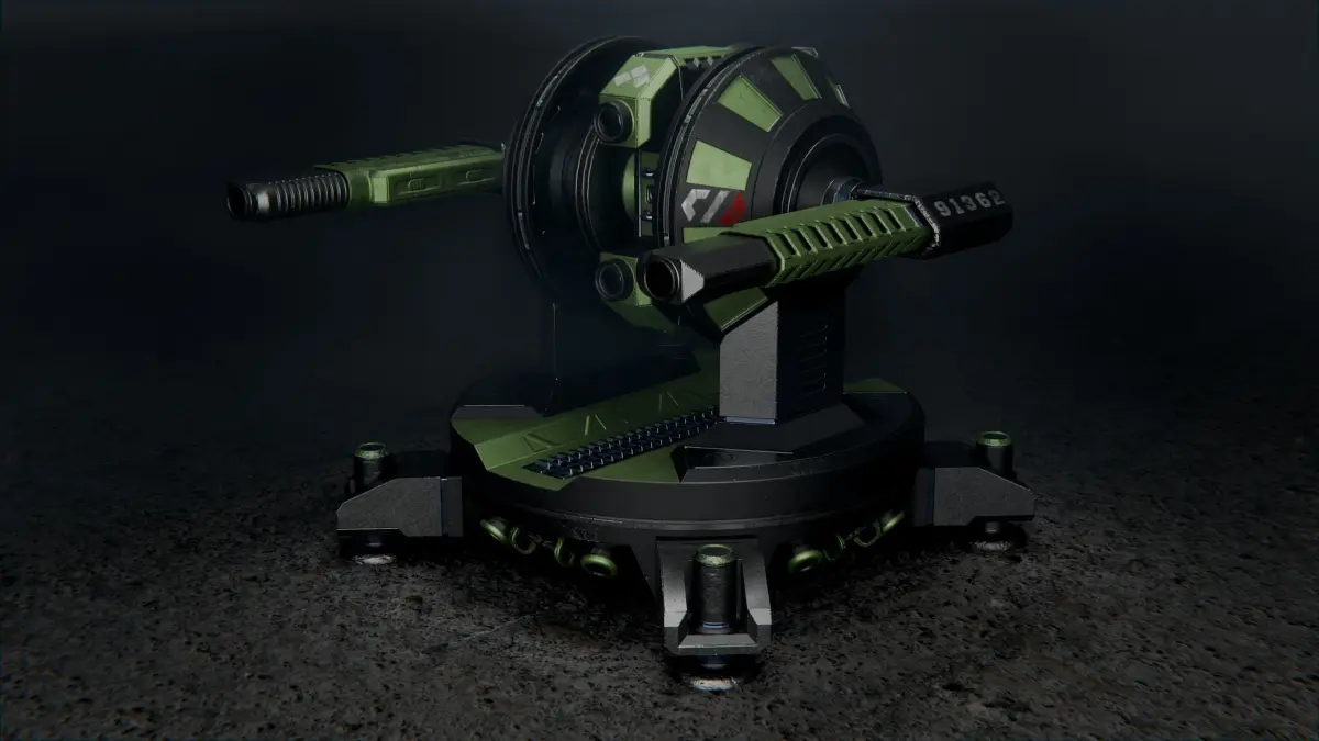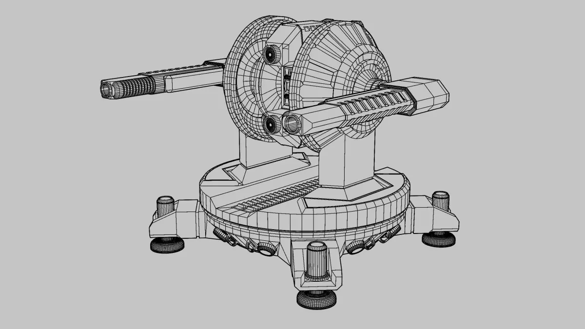 Sci-fi turret with two heavy guns mounted on the side. It is designed to be placed on the ground or a large vehicle. The model includes one simple aiming animation.