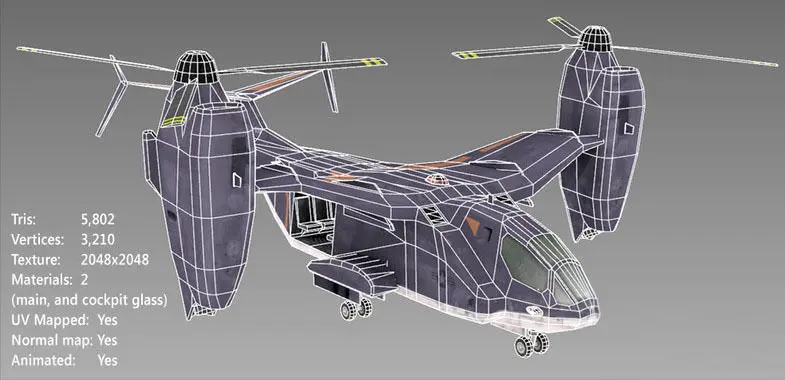 This is a sci-fi VTOL aircraft, inspired by the V-22 Osprey. It has animated landing gear, doors and propellers, and a detailed interior. A destroyed version with cracked cockpit glass and other details is included.