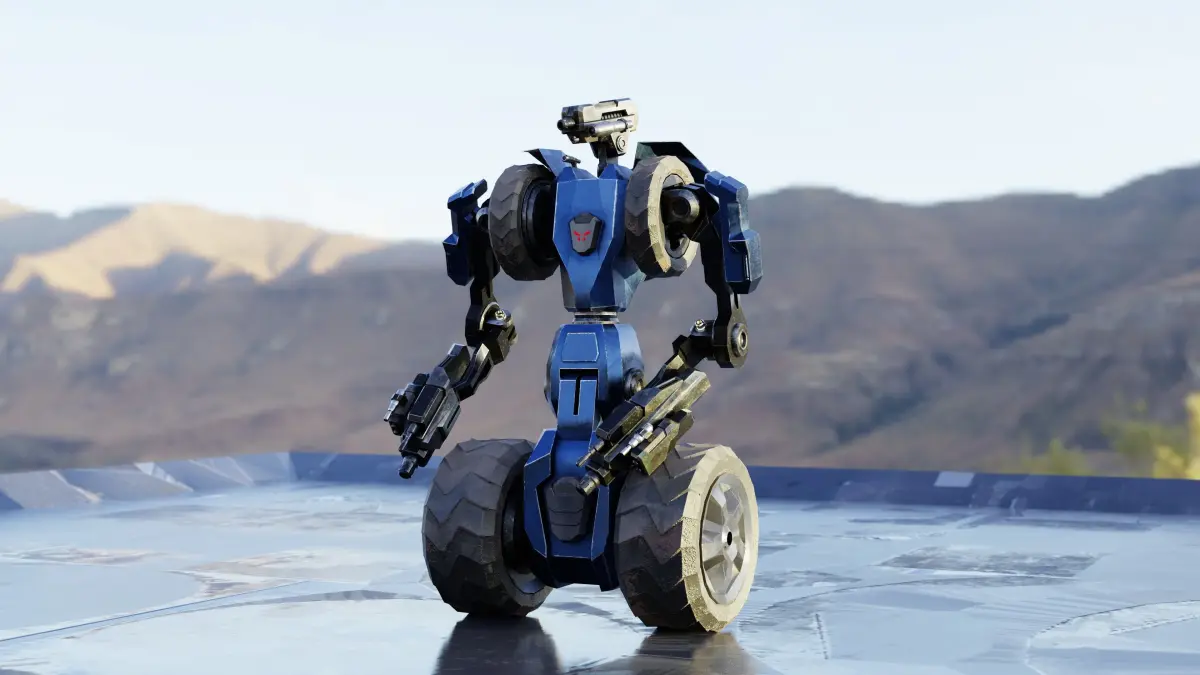 Robot fighter.The model is made with Blender 2.81 and the main .blend file contains all the textures (You can unpack the model to separate the textures into a folder).The model is rigged but you might want to change the rig so as to fit your specific needs.