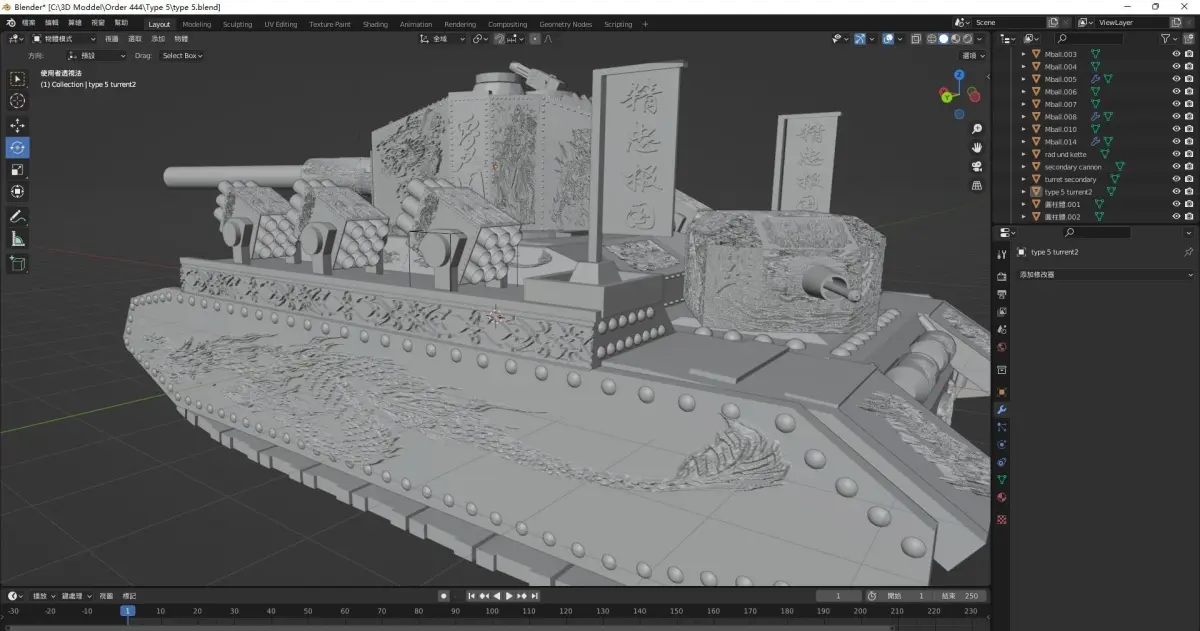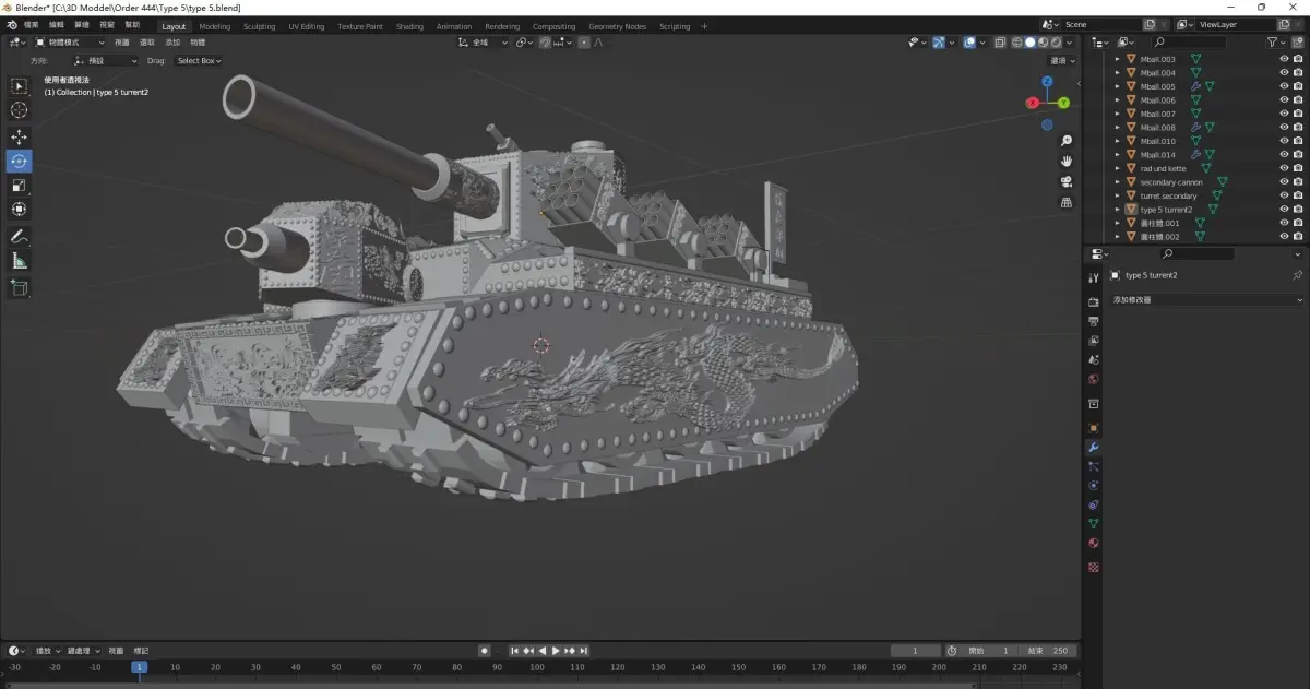 This is a tank that i developed with blender,the inspiration come from Type 5 Heavy in World of Tanks ,T-35, O-I heavytank and my imagnation.It is a big Iron Monster with 152mm Cannon,Rocketthrower,Flamethrower and machine gun .At the same time there are a lot of asian style textures on it make it strange and cool.You can just print it with 3D printer make it as a miniture in Table Wargames or as a decoration if you like it.