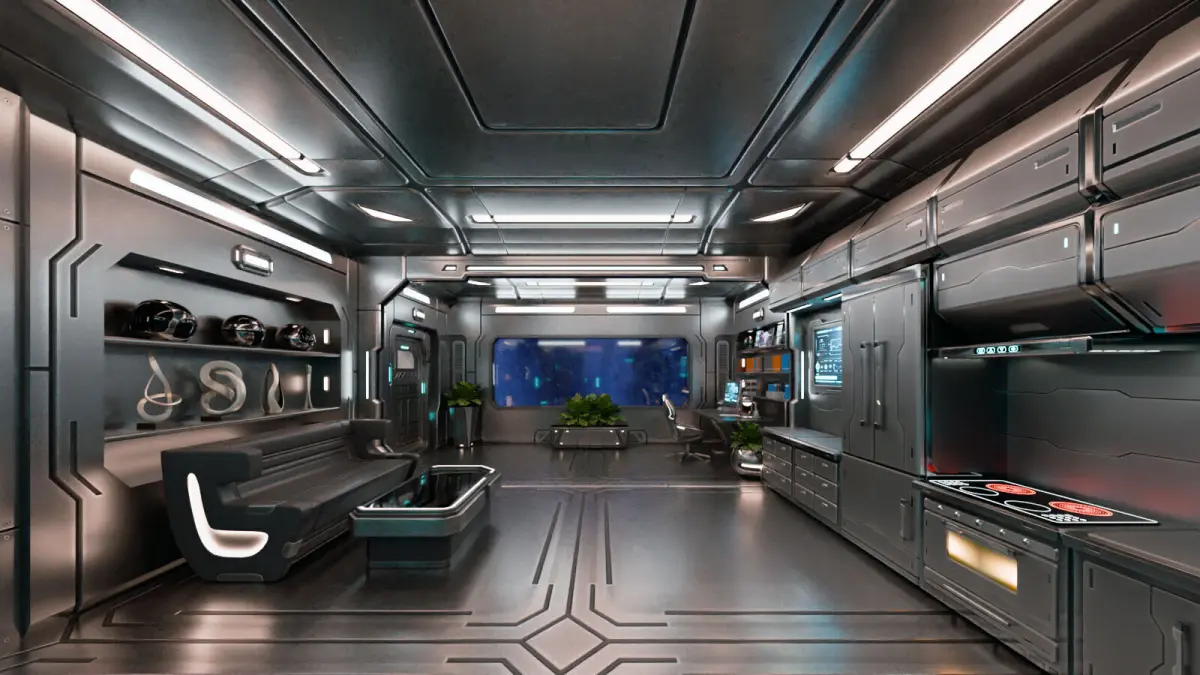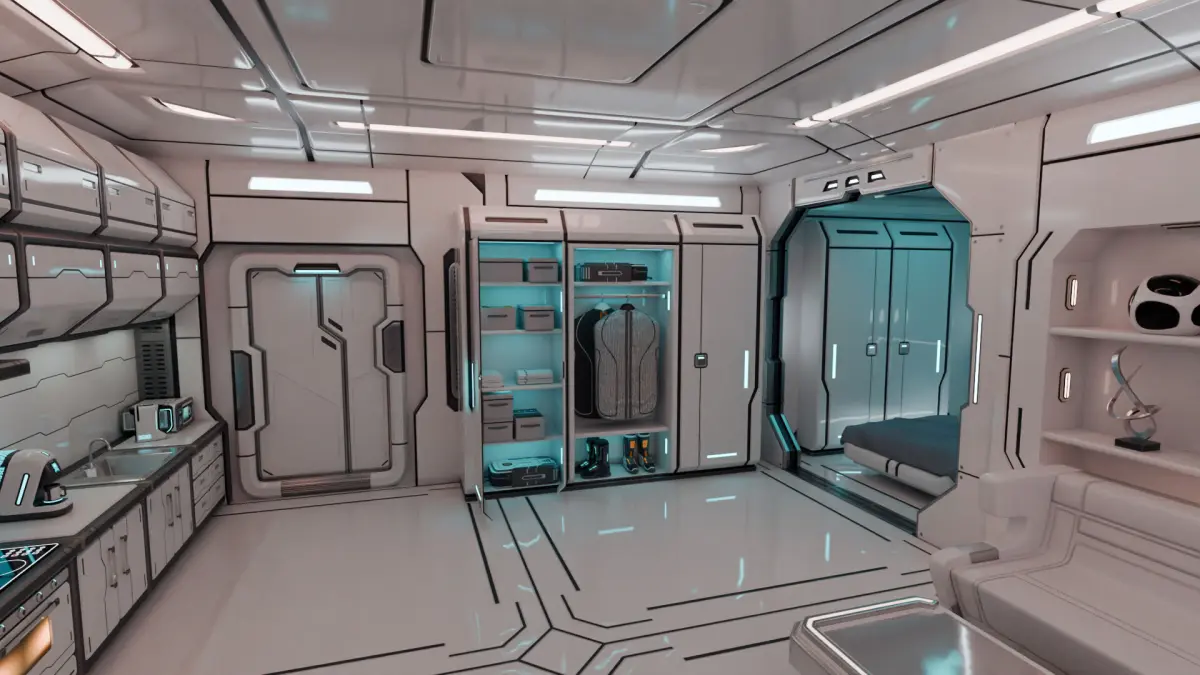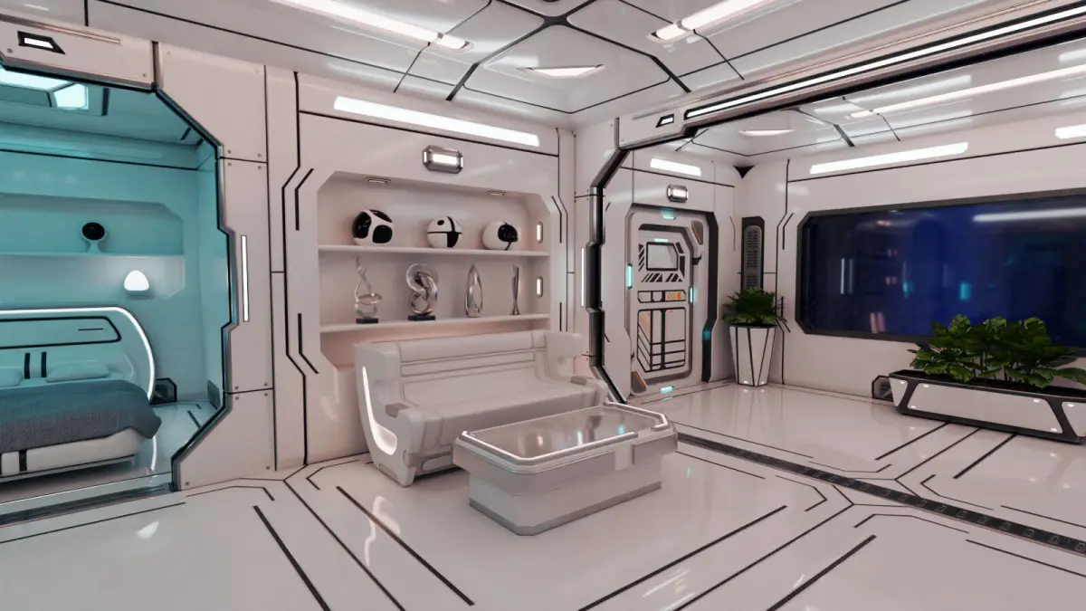 Sci-Fi Living room (apartment) interior including hall, bedroom, work area, bathroom