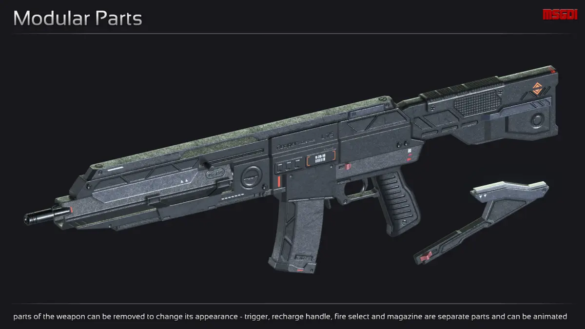 This pack contains a scifi weapon with modular attachments and ammunition. It can be used in a first or third person shooter.