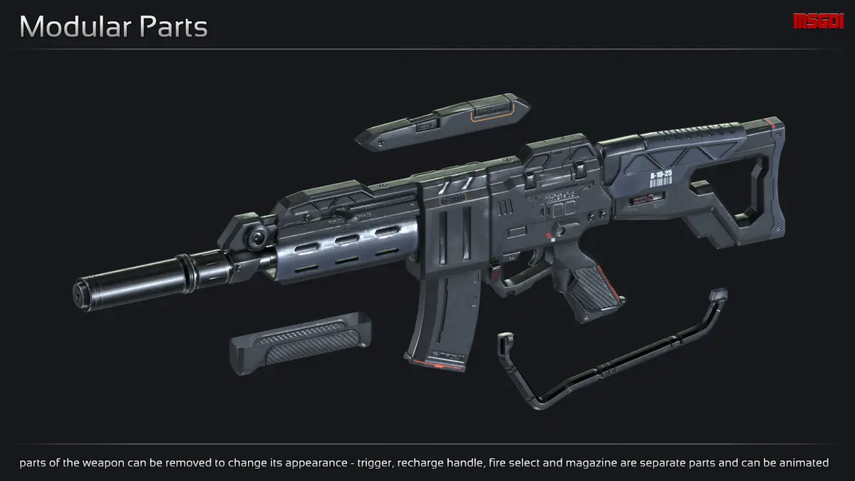 This pack contains a scifi weapon with modular attachments and ammunition. It can be used in a first or third person shooter.