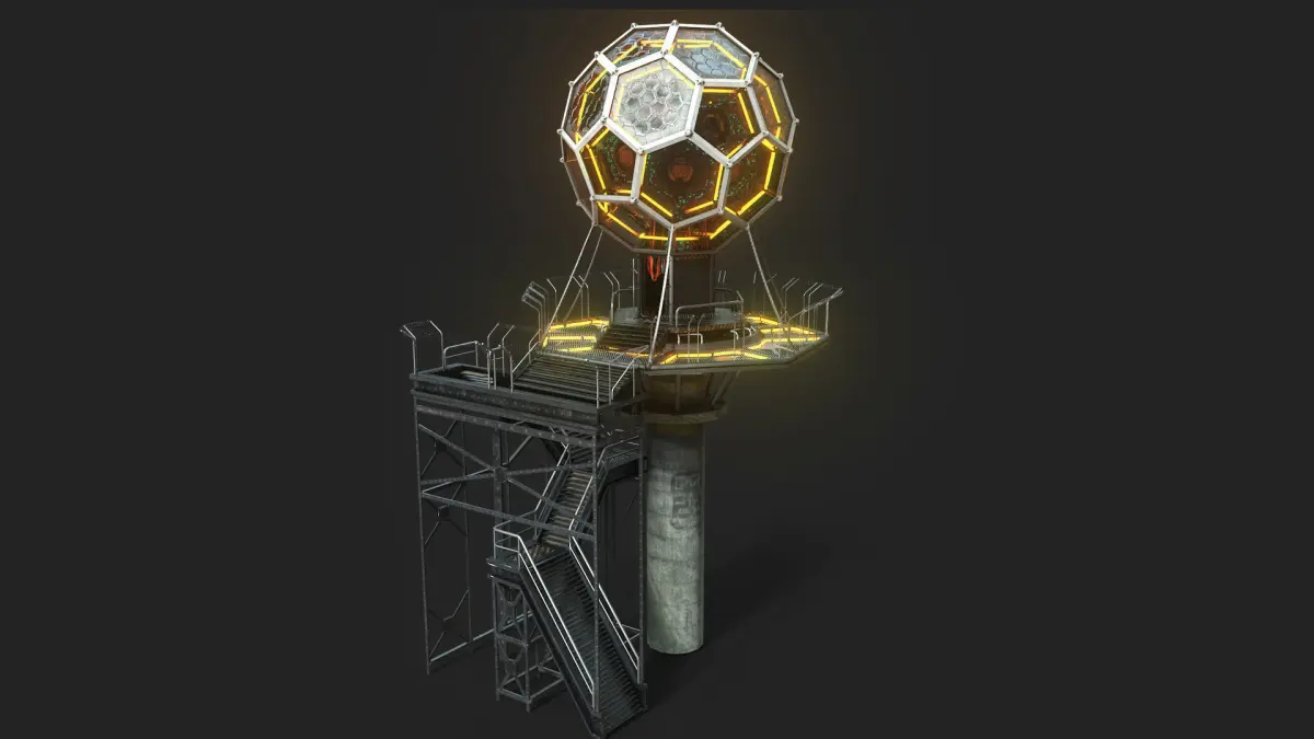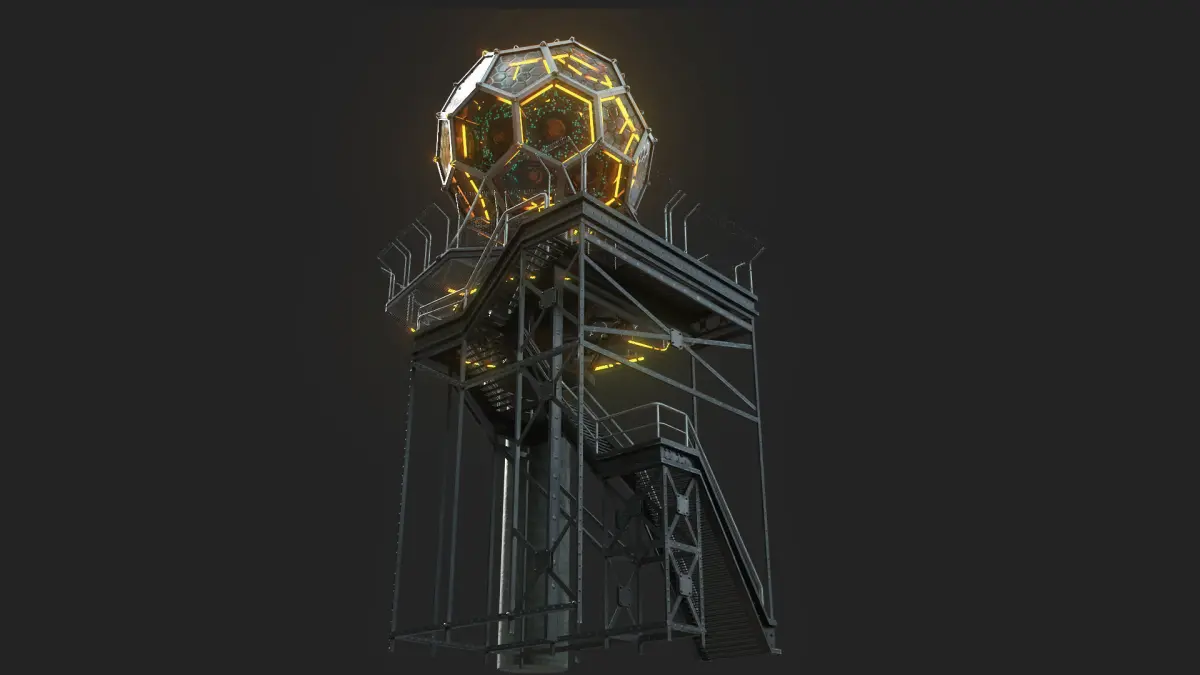 Style and Form: This 3D model represents a science fiction data tower, inspired by visions of technologically advanced and dystopian worlds. The tower has a complex and geometric shape, with an upper dome housing the core of the structure, an intermediate platform with stairs and railings, and a cylindrical base supporting the entire assembly.