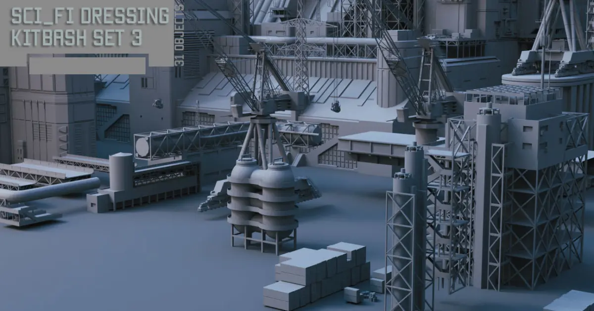 31 scifi urban structure pieces to dress your 3d scenes . This can be used to create whitebox test assets or look development. I also included 2 combinations of how the assets can be arranged.