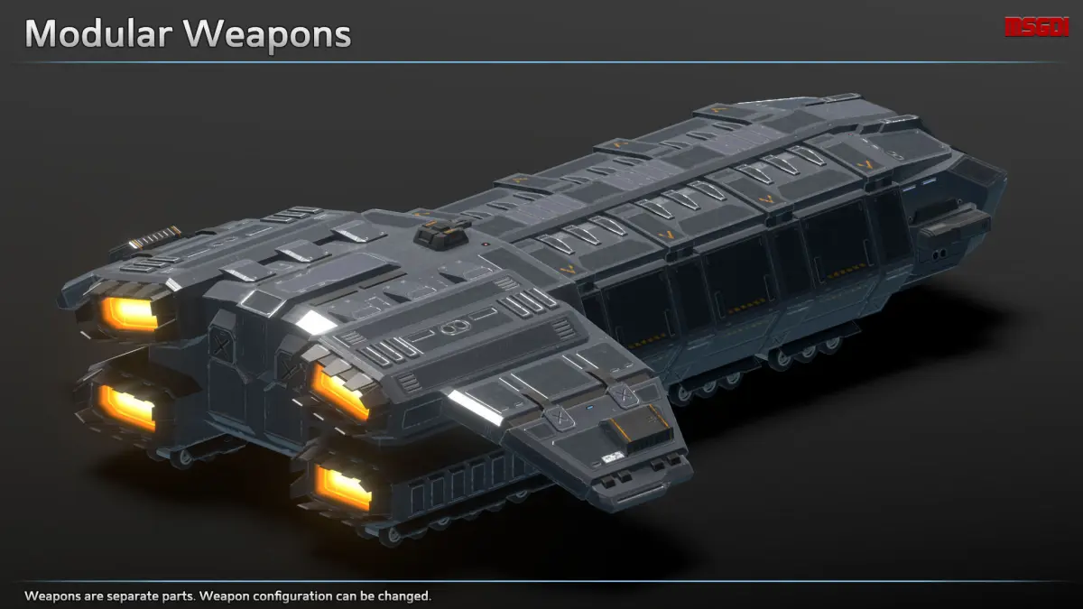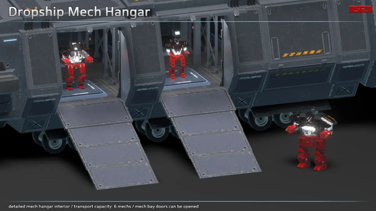 This pack contains a scifi dropship with modular weapons. It has a fully modeled mech hangar interior.