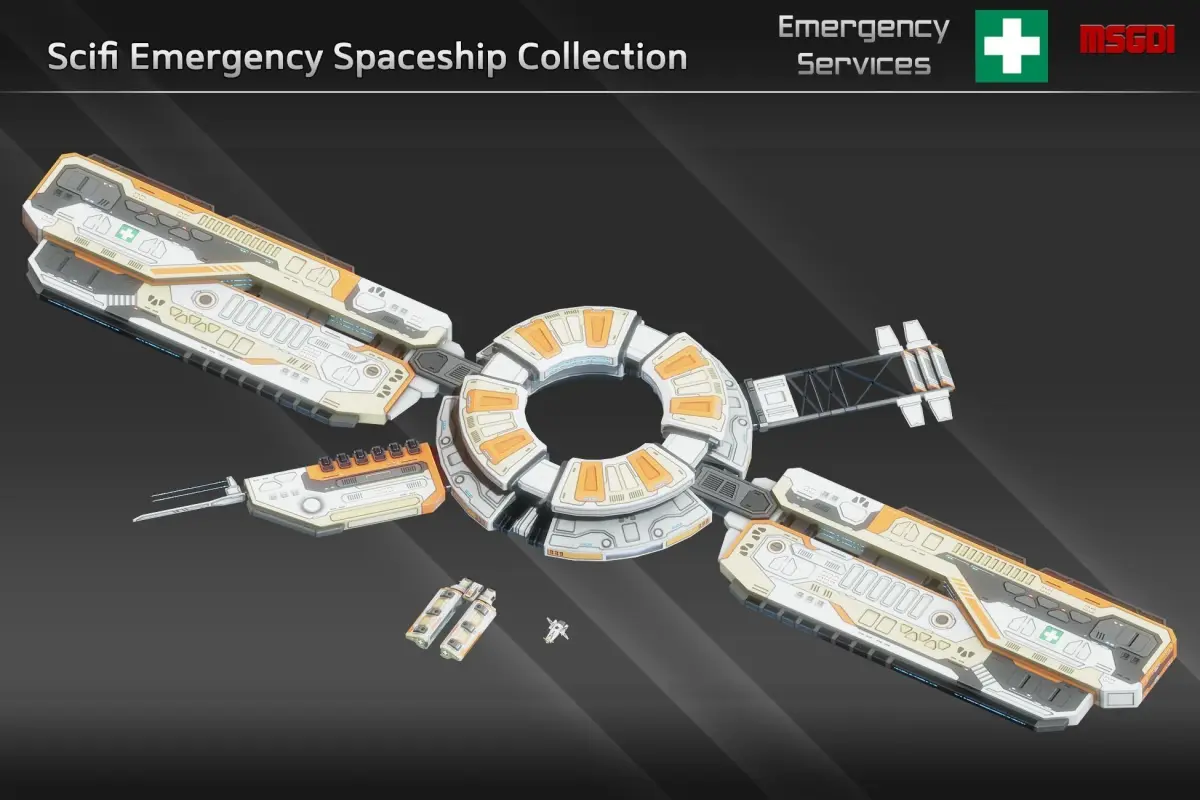 This bundle contains 2 emergency/rescue spaceships and a modular space station. The models can be used in a space themed game.