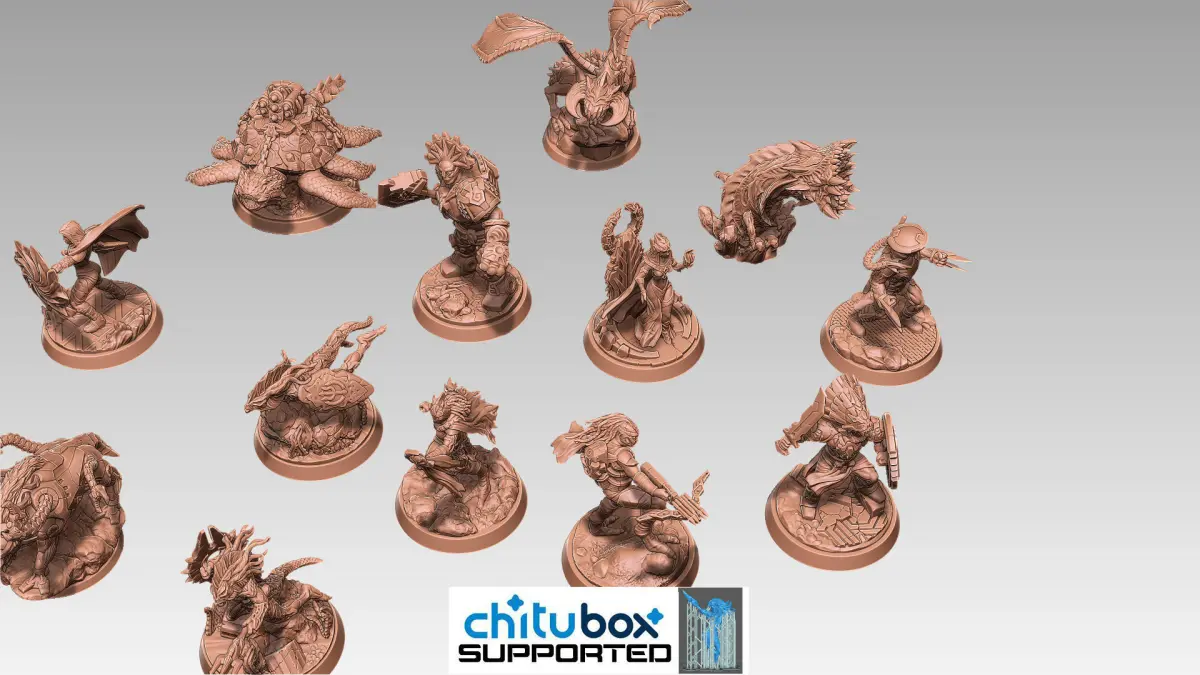 Thirteen Sci-fi Fantasy Minis with bases, all pre-supported in Chitubox and test printed on resin and filament printers.