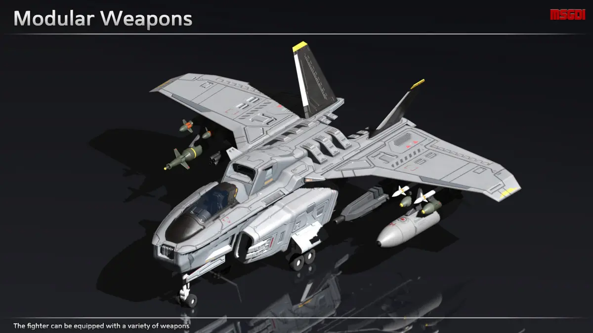 This pack contains a scifi fighter with modular weapons and decals. It can be used in a scifi or space themed game.