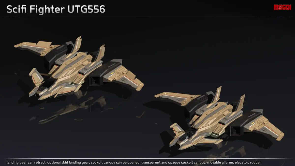 This pack contains a scifi jet fighter with modular weapons and decals. It can be used in a scifi or space themed game.