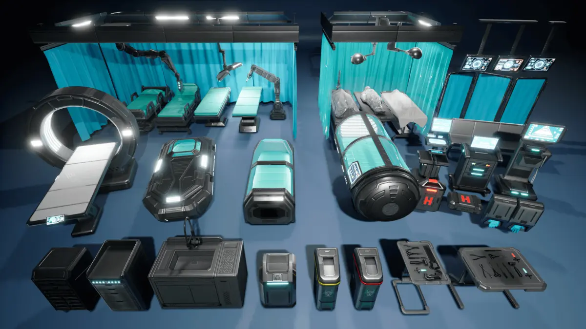 Sci-Fi Hospital Props designed for a futuristic/Sci-Fi medical environment.It features essential elements for ward, operating room, and morgue settings, with detailed props that can enhance any hospital scene.