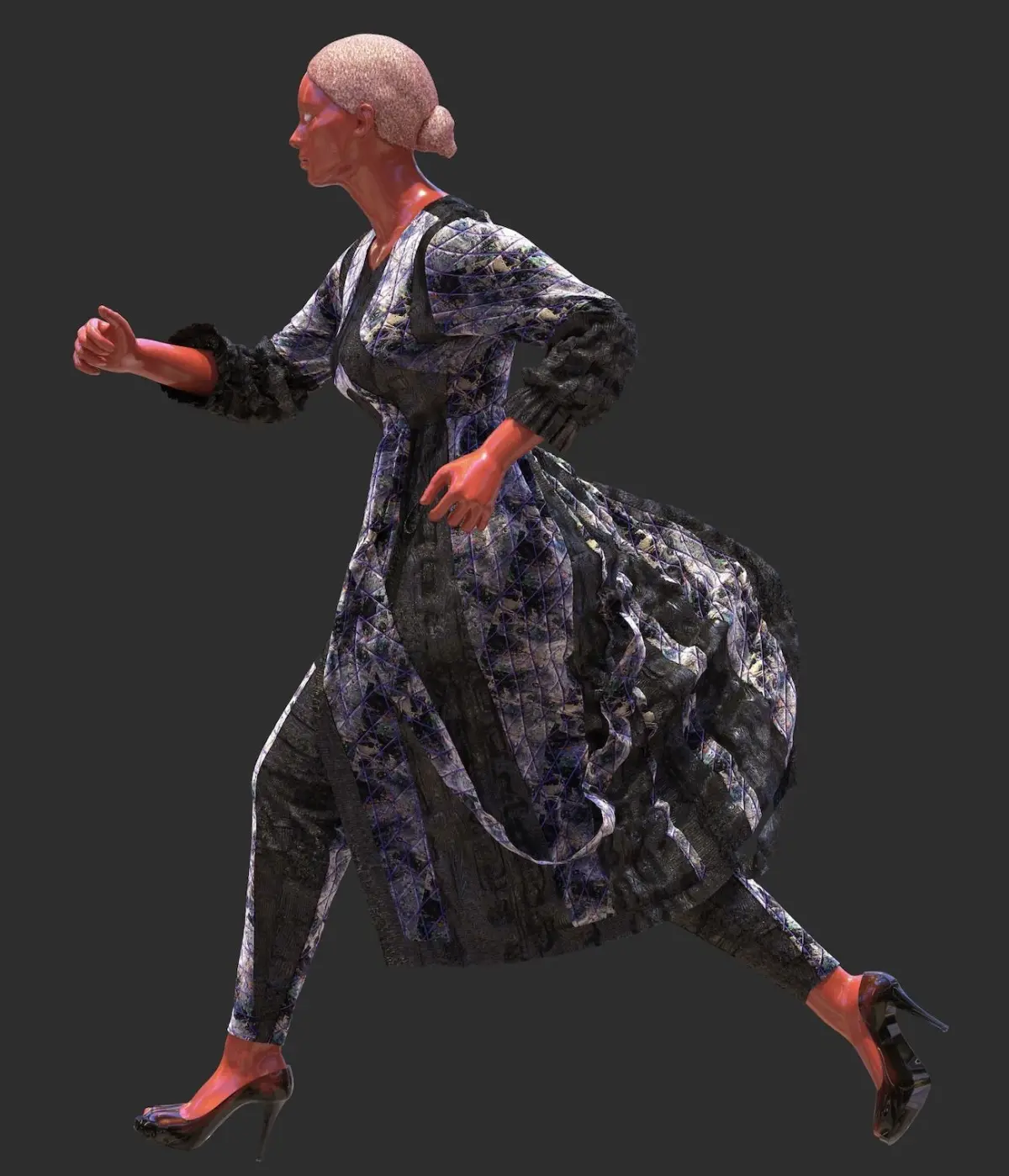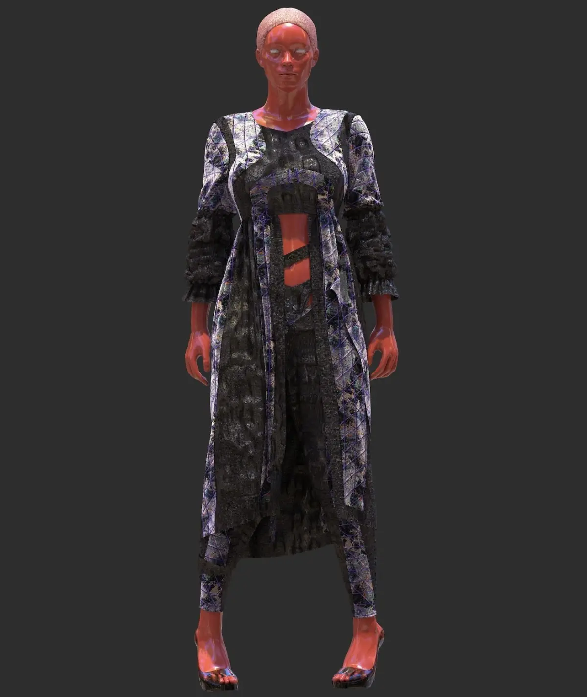 File comes in a standard hands-down pose. Garments include: multi-colored jacket with trim, shirring, and broken glass-style paneling; Wide V-line pants with matching thong, and fabric cutouts