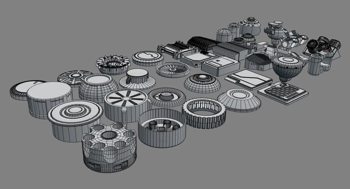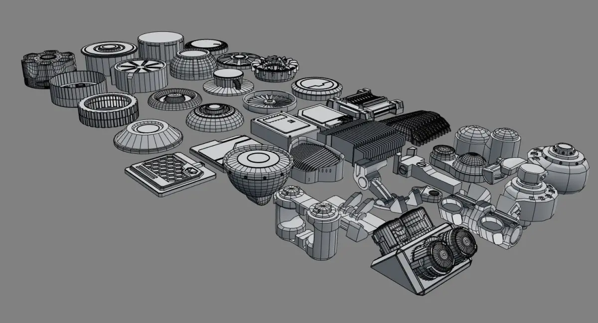 A collection of various parts, designed to build futuristic vehicles, buildings, machines, weapons...