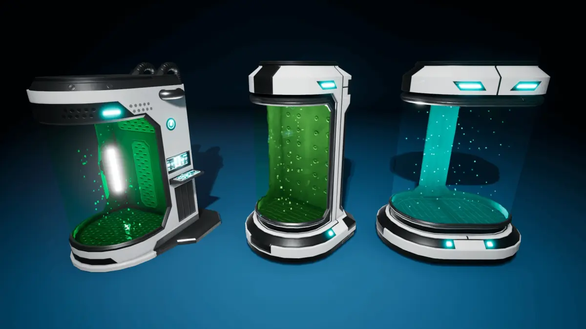 The product is designed for futuristic or Sci-Fi game and video production environments, labs, and research facilities. This collection offers a wide variety of cryogenic capsules for storing creatures, samples, or humanoid characters in stasis state.