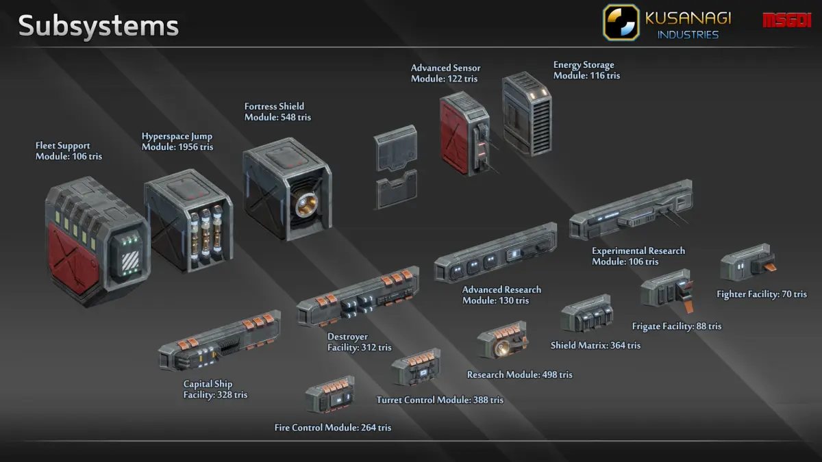 - Final tris count depends on how many subsystems are used for the shipyard