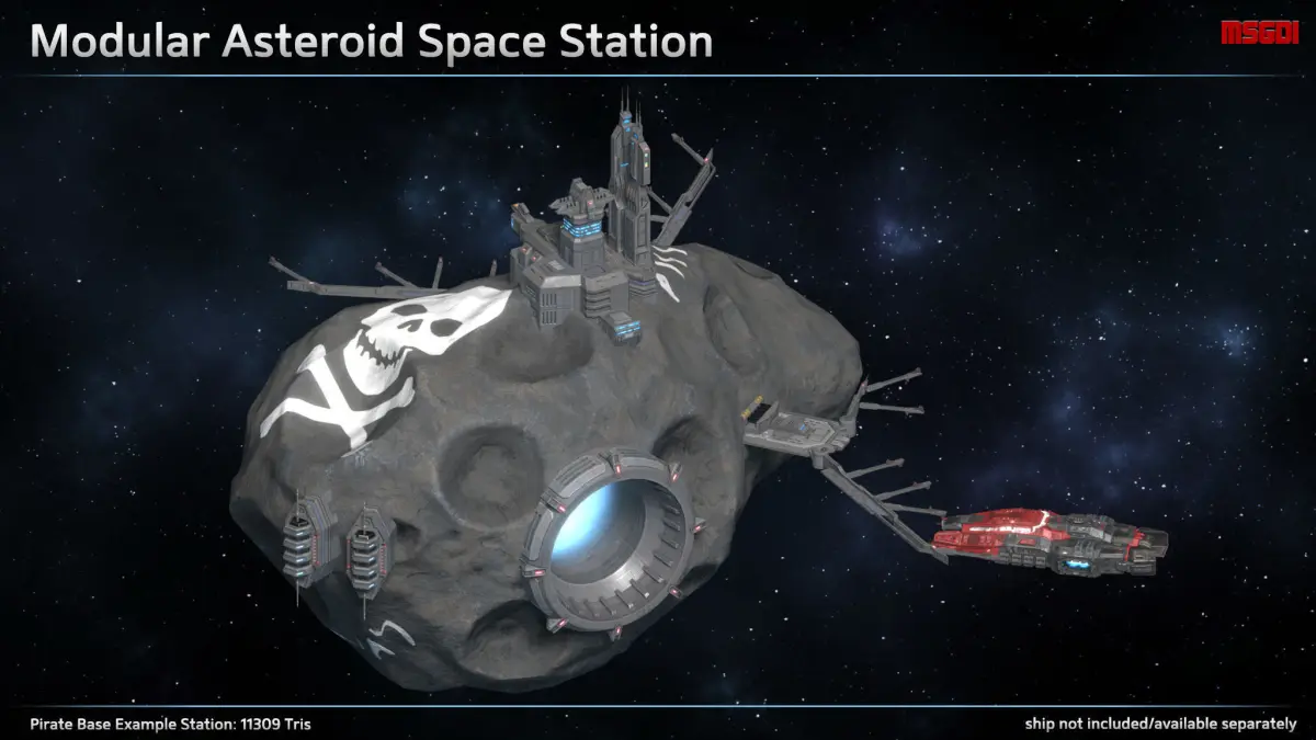 This pack contains a modular asteroid space station. It can be used in a space themed game.