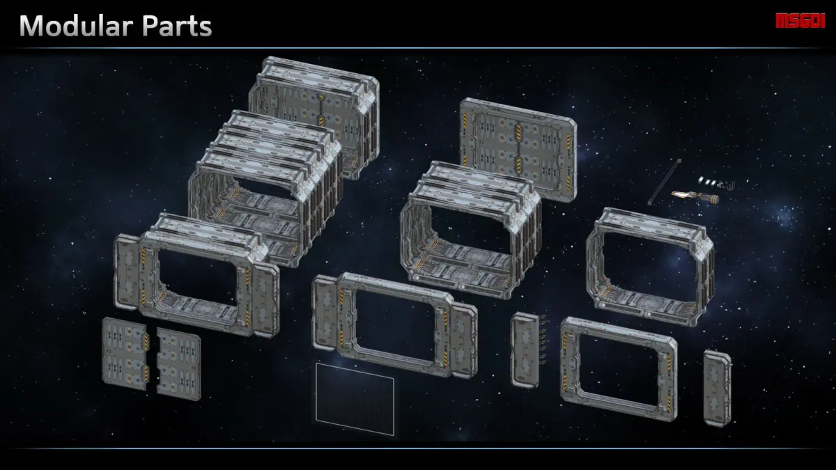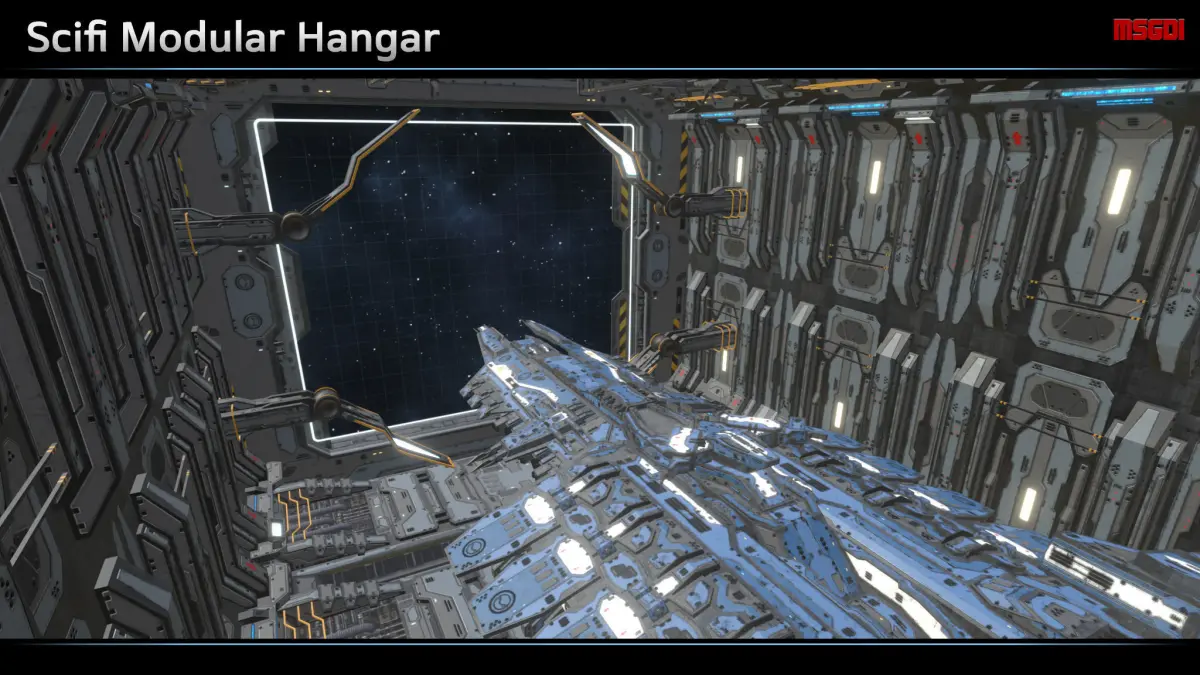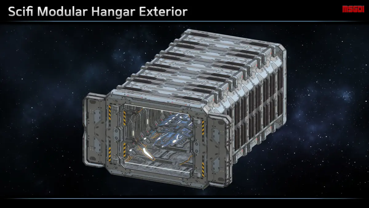 This pack contains a modular hangar. It can be used as in-game background scene, e.g. for changing, repairing, upgrading ships.