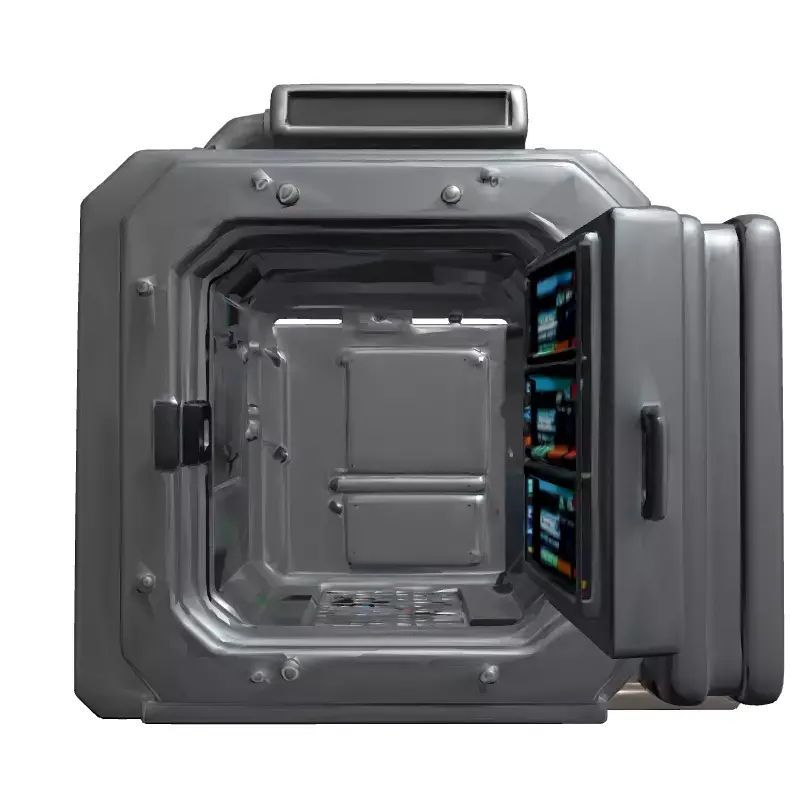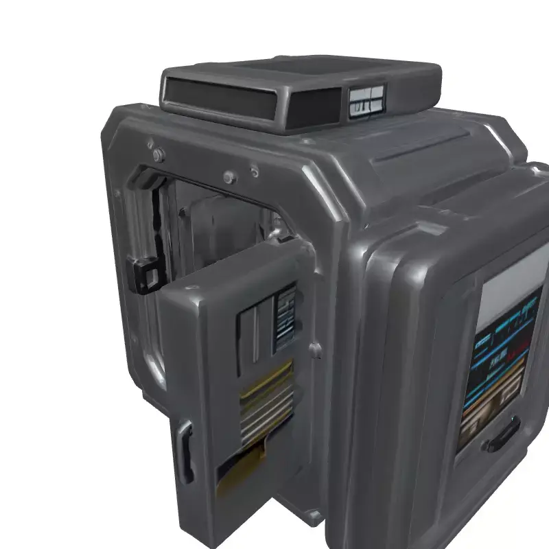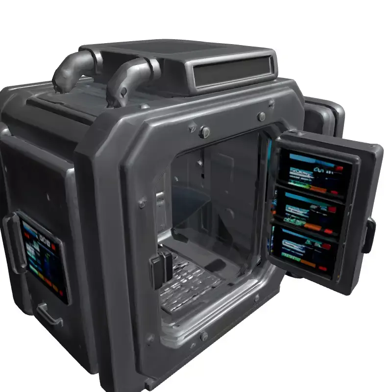 This is a meticulously crafted 3D model of a futuristic, modular laboratory incubator or advanced secure storage unit, designed with a robust sci-fi aesthetic. The model features a heavy-duty, industrial grey exterior adorned with visible bolts and sturdy panels, conveying durability and high-tech functionality. Its articulated design includes a meticulously detailed interior chamber, accessible through an openable door, complete with a grated floor texture and additional metallic paneling. Prominently integrated digital displays on the exterior and interior provide dynamic readouts, enhancing the futuristic immersion. Advanced ventilation pipes and a top-mounted air grille suggest sophisticated climate control or environmental sealing capabilities. This asset is perfectly suited for a wide array of digital projects, including immersive sci-fi game development, creating realistic environments for virtual reality (VR) and augmented reality (AR) experiences, detailed architectural visualizations of future facilities, and high-quality renders for film, animation, or digital art. The model boasts clean, optimized topology, ensuring efficient performance in real-time engines while retaining high visual fidelity for cinematic close-ups. It is fully UV unwrapped with professionally crafted PBR (Physically Based Rendering) textures, guaranteeing realistic material interactions under various lighting conditions. Supported file formats typically include GLB, FBX, OBJ, and USD, offering broad compatibility across major 3D software and game engines. This asset is ready to be integrated into your next project, offering a versatile and visually striking piece of advanced technology.