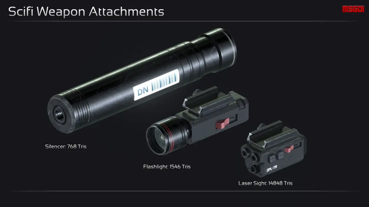 This pack contains modular scifi weapon attachments. They can be used in a first or third person shooter.