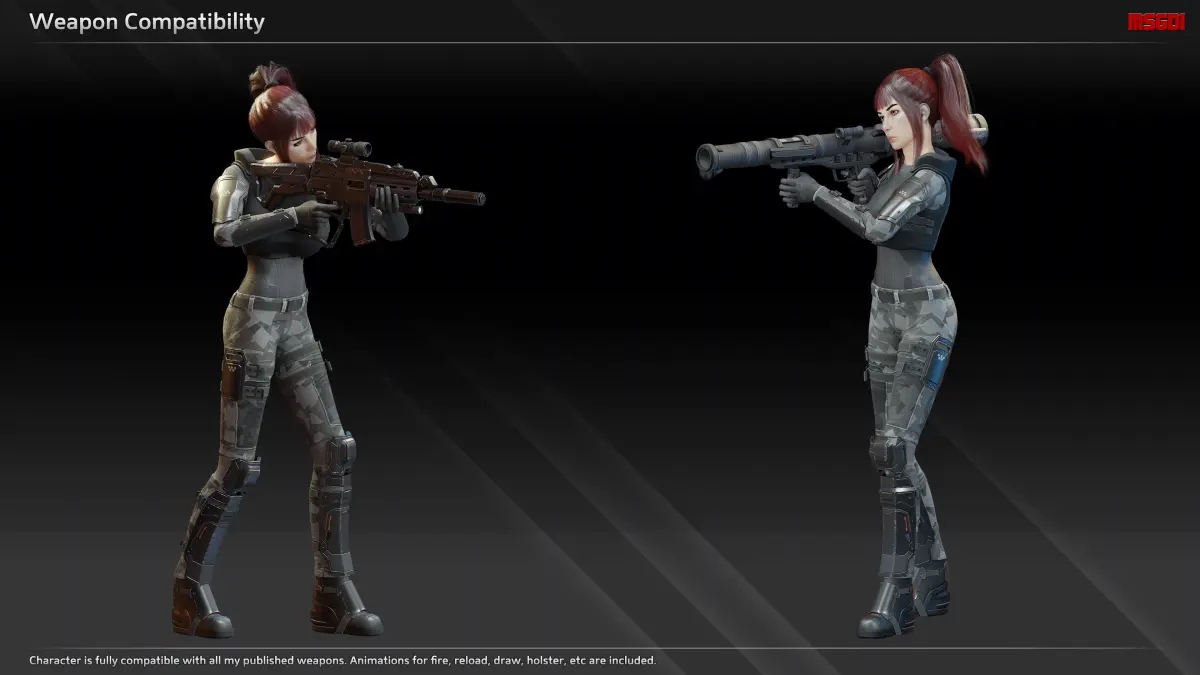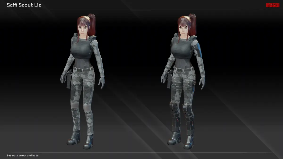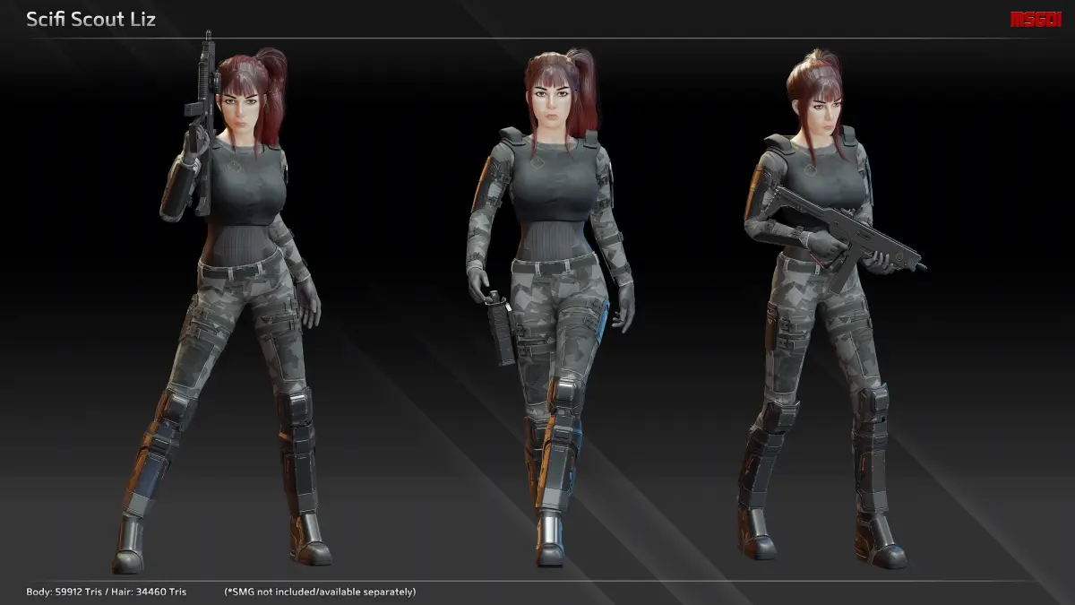 This pack contains the scifi scout Liz. The character is designed for animation retargeting.