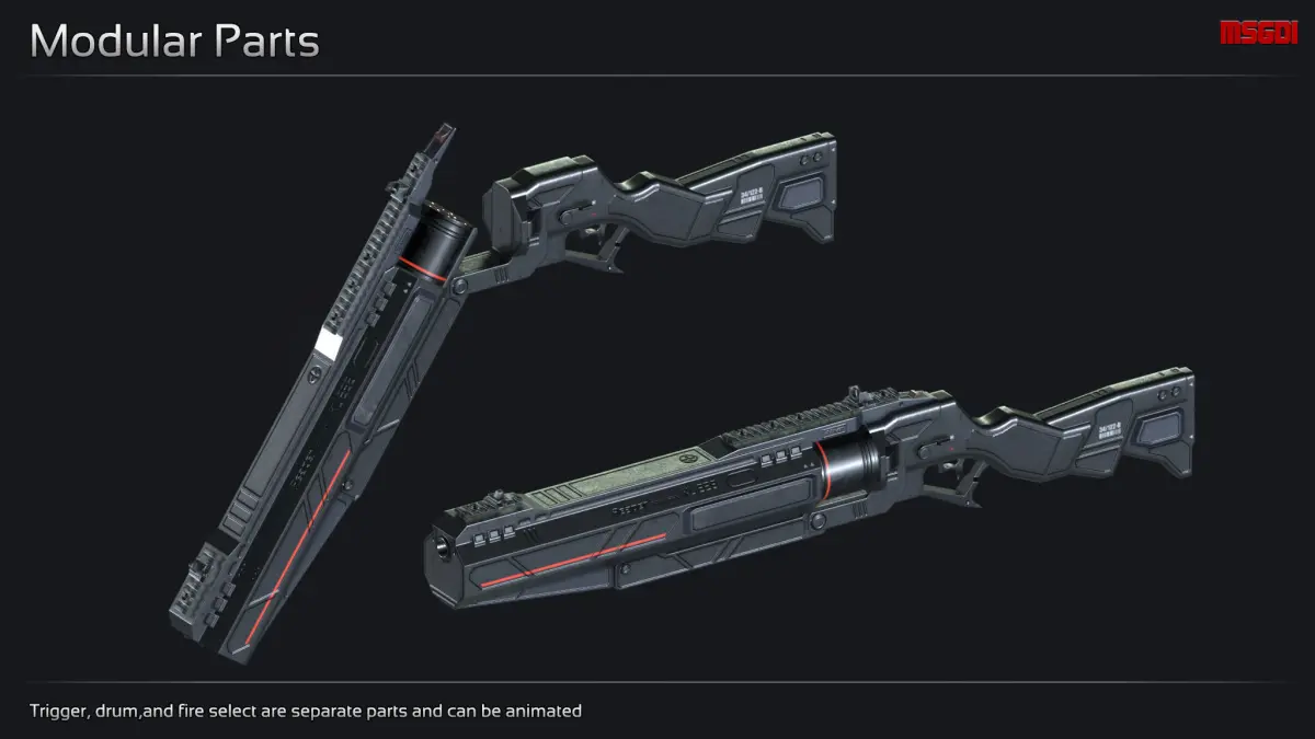 This pack contains a scifi weapon with modular attachments and ammunition. It can be used in a first or third person shooter.