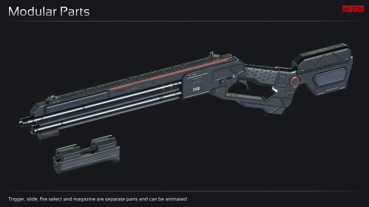 This pack contains a scifi weapon with modular attachments and ammunition. It can be used in a first or third person shooter.