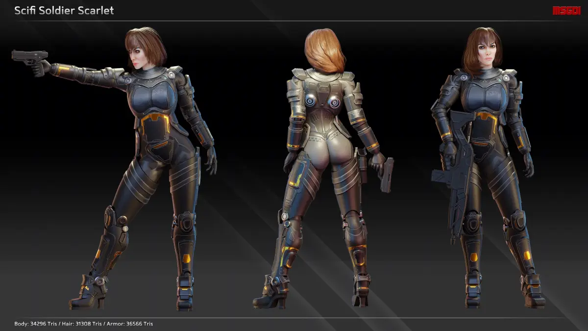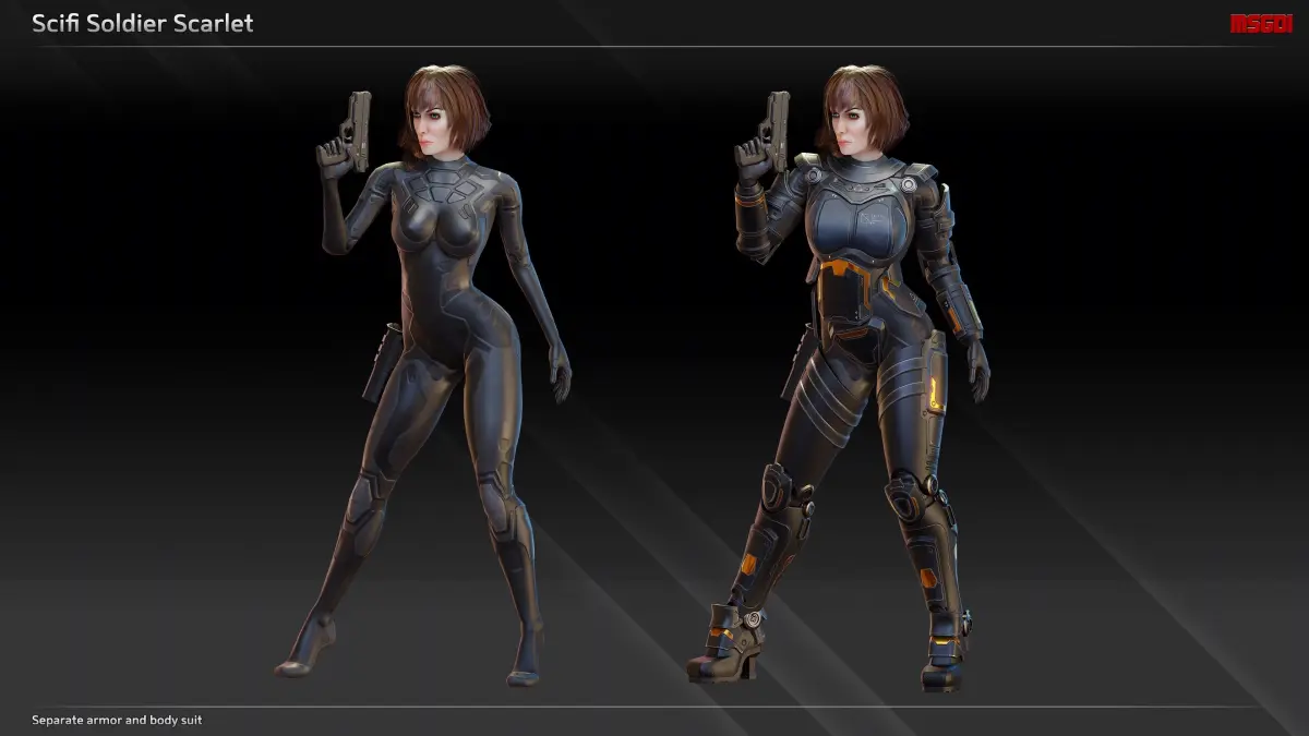 This pack contains the scifi soldier Scarlet. The character is designed for animation re-targeting.