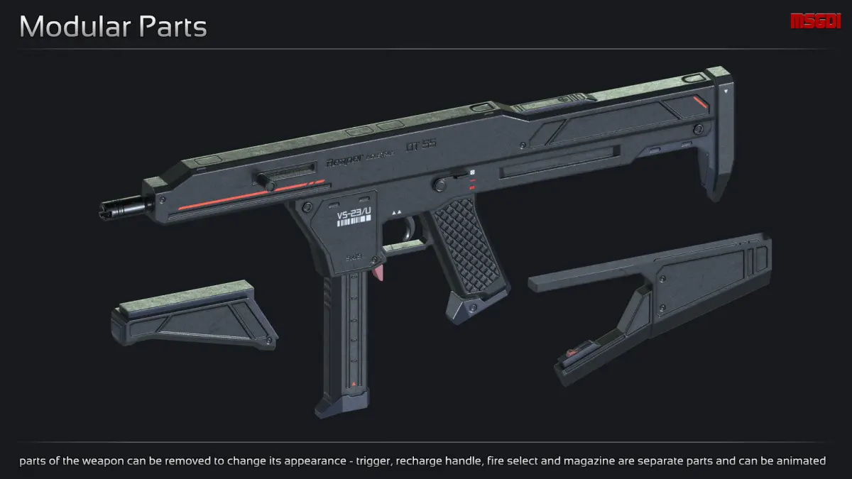 This pack contains a scifi weapon with modular attachments and ammunition. It can be used in a first or third person shooter.