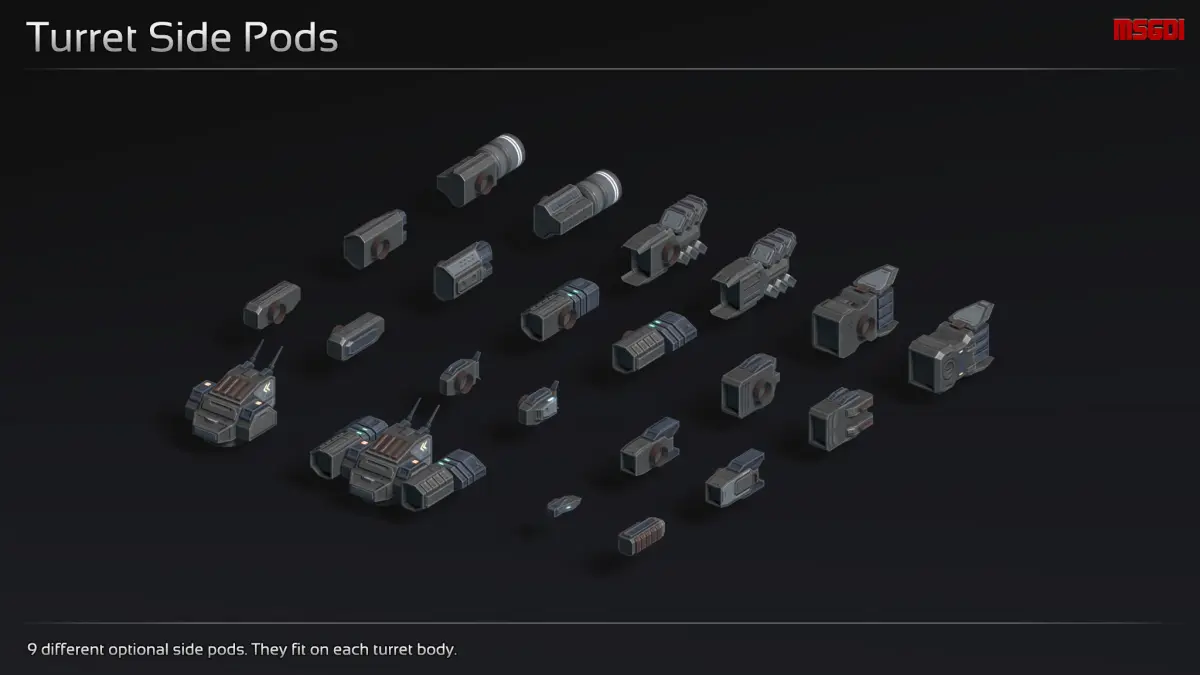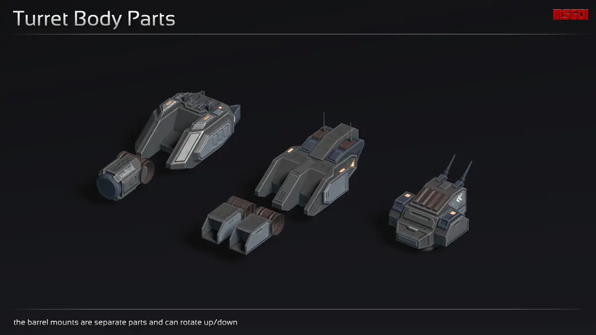 This pack contains modular scifi turrets parts. They can be used in a turret defense game or as ground defenses in a mech/tank game. The barrels/missile racks from the “Modular Mech Weapons” pack are compatible with these turrets.