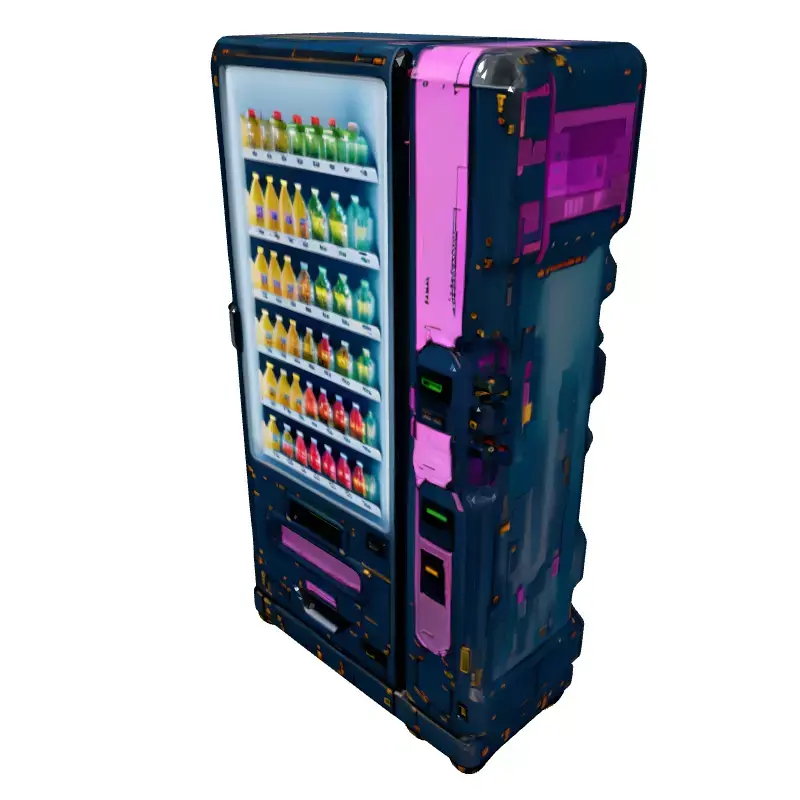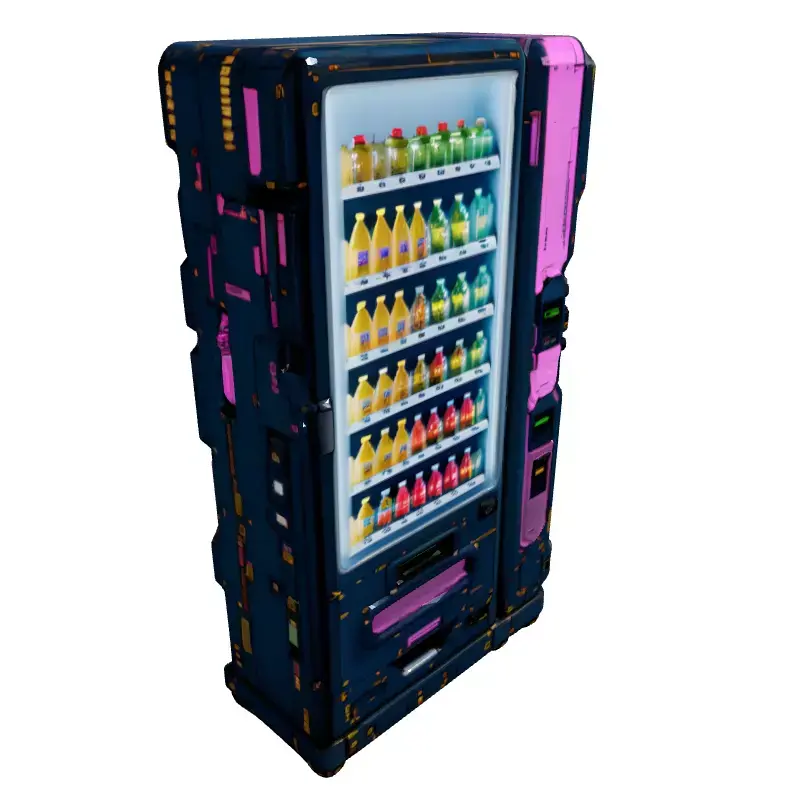 This 3D model presents a futuristic vending machine, ideal for science fiction environments. Perfect for game development, architectural visualization, and other digital art projects. The model comes in various file formats including GLB, OBJ, FBX, and STL, ensuring compatibility with most 3D software. Optimized for both real-time and offline rendering, it's versatile for game engines and high-quality renders alike. The design features a sleek, dark chassis accented with vibrant neon lights and a transparent display showcasing an assortment of bottled beverages. Its unique blend of practicality and futuristic aesthetics makes it a valuable asset for any sci-fi project. Key features include detailed modeling, clean topology, and PBR textures. The model is UV unwrapped and ready for use in your scenes. Whether populating a cyberpunk cityscape or equipping a space station, this vending machine adds a touch of futuristic realism.