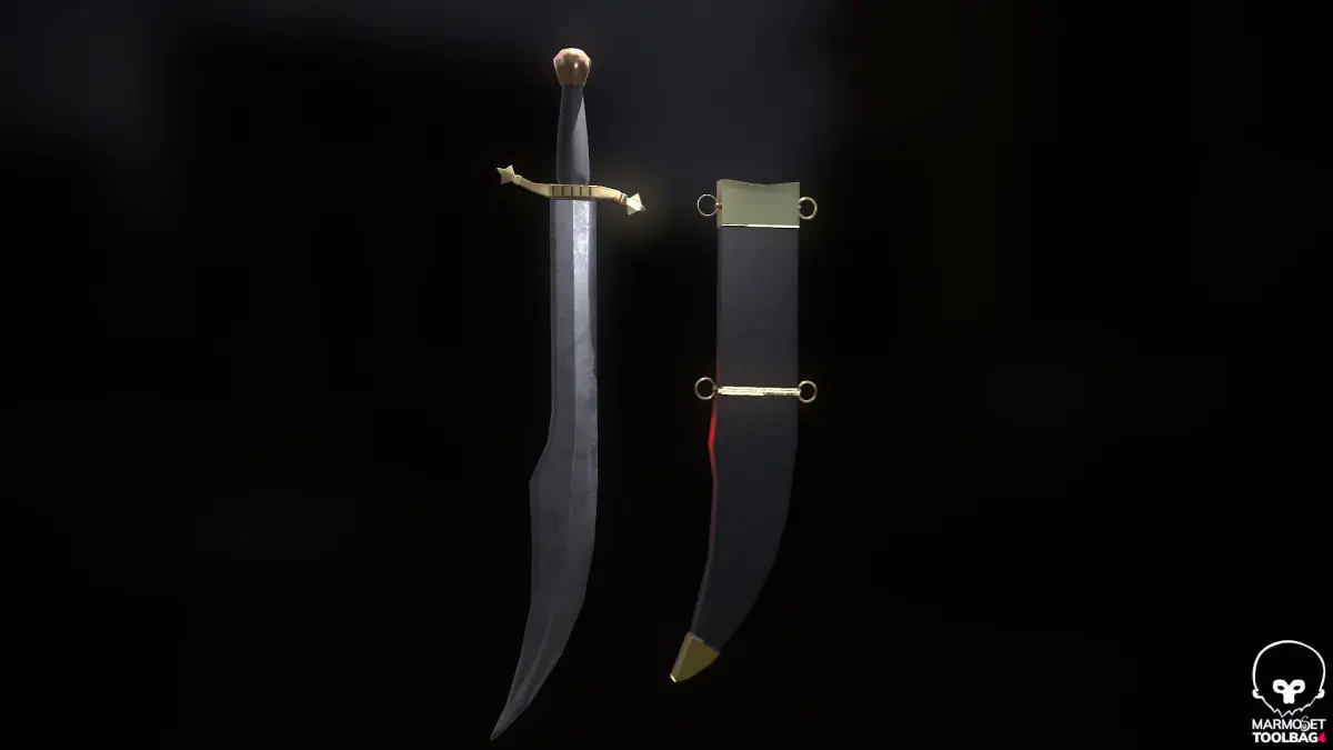 Classic curved sword. Render in Marmoset 2k MAP (Albedo, Normal, AO, Roughness, Metalness) Files format : FBX, OBJ, render ArnoldAll uv open. Made in maya
