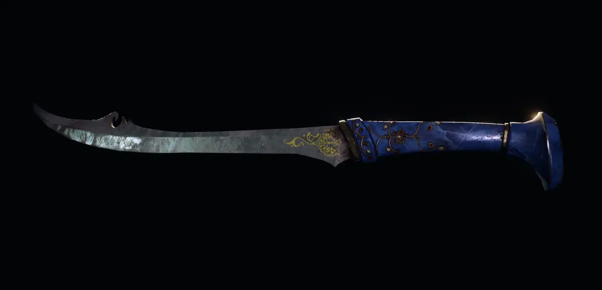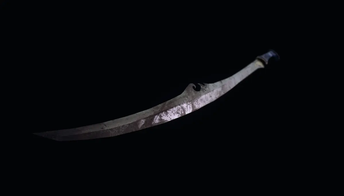 Fantasy scimitar sword with marbled celestite gem hilt encrusted with rubies and filigree. Inspired by historical jewelled daggers from Mughal era India. Custom PBR materials (Textures included)