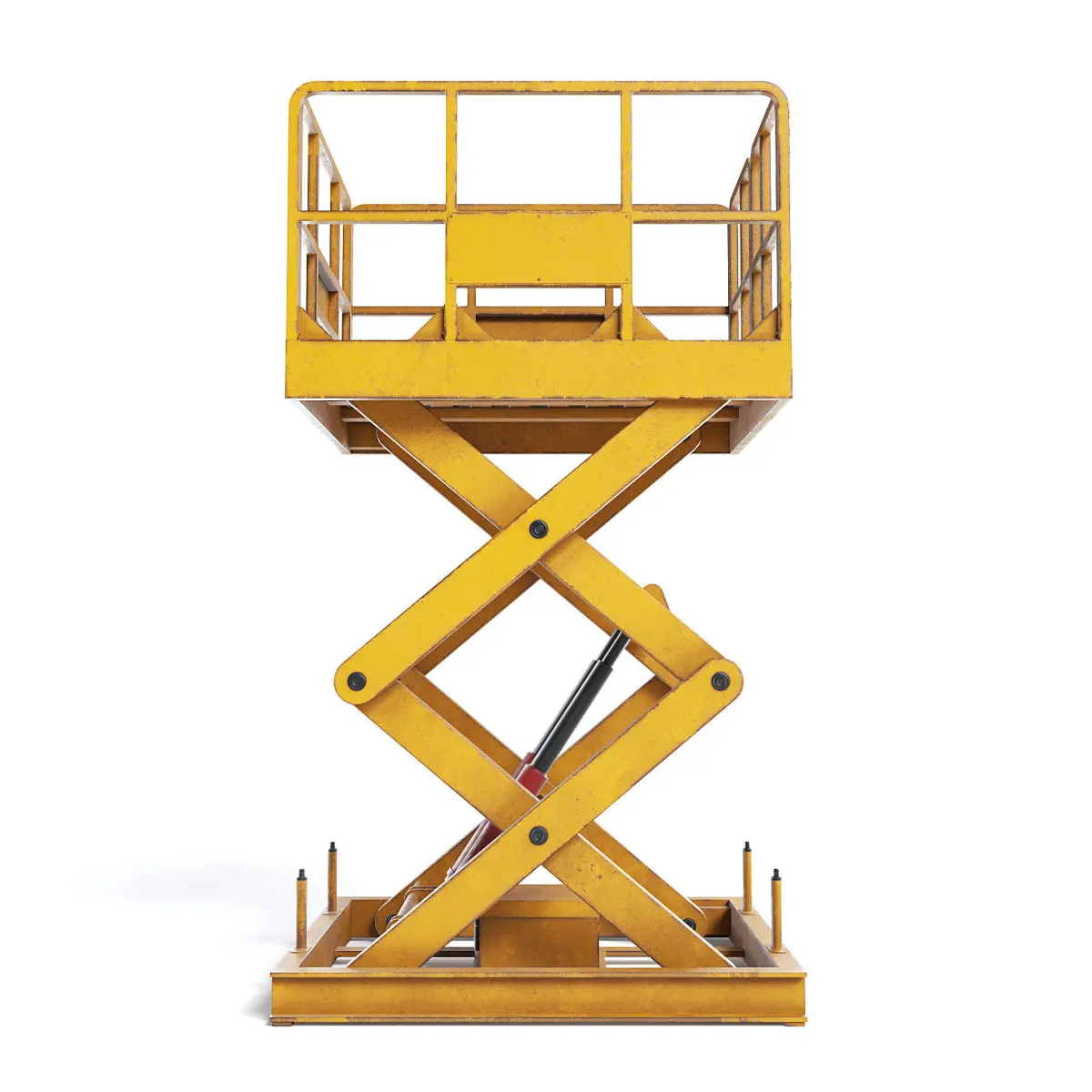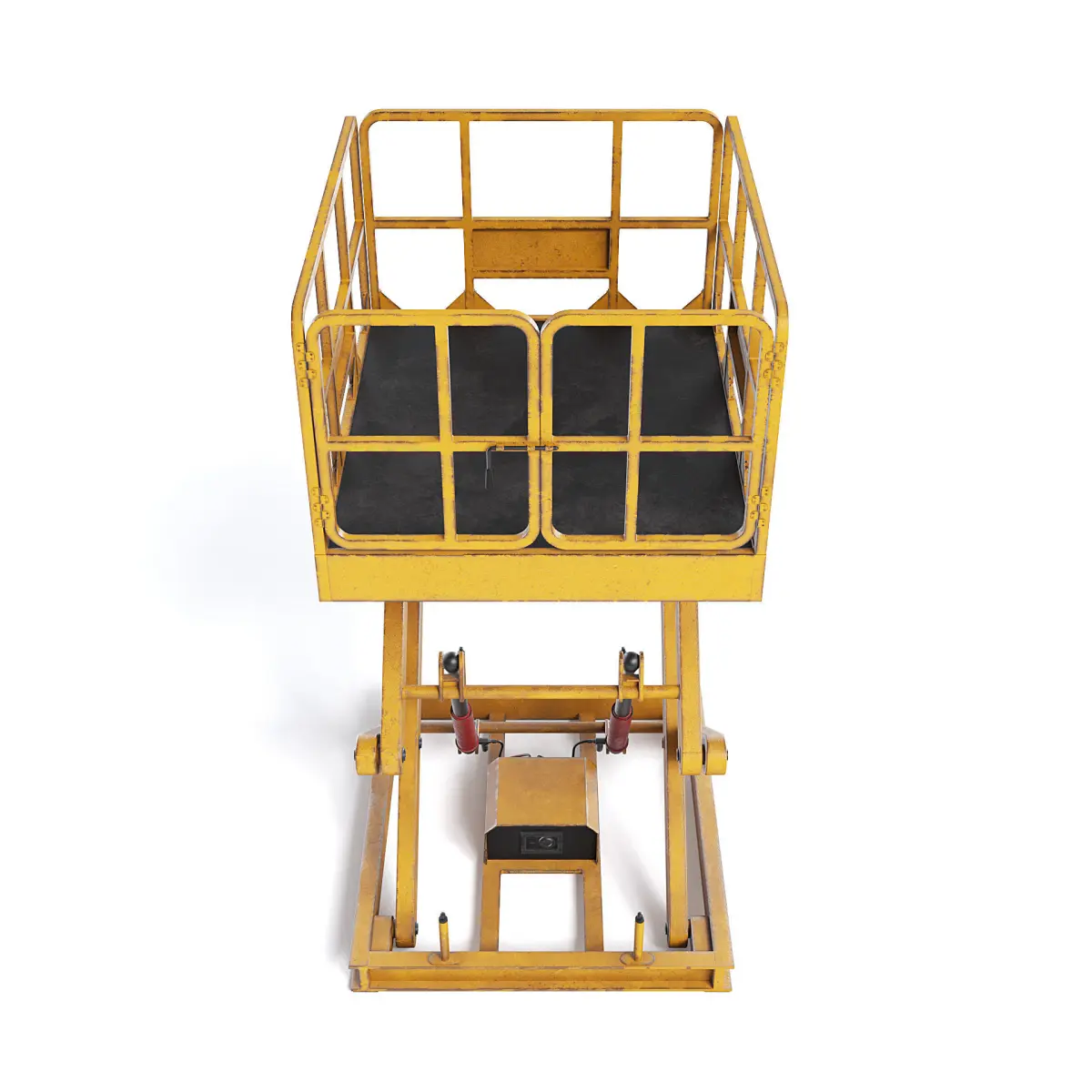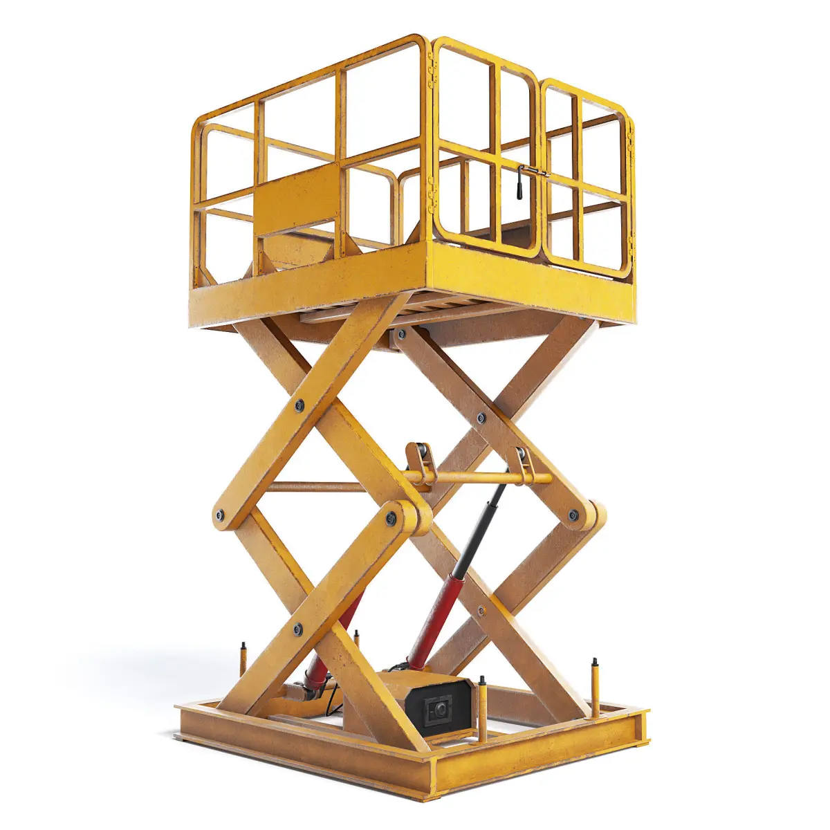 Orange scissor freight lift with slitghy scratches and rust.