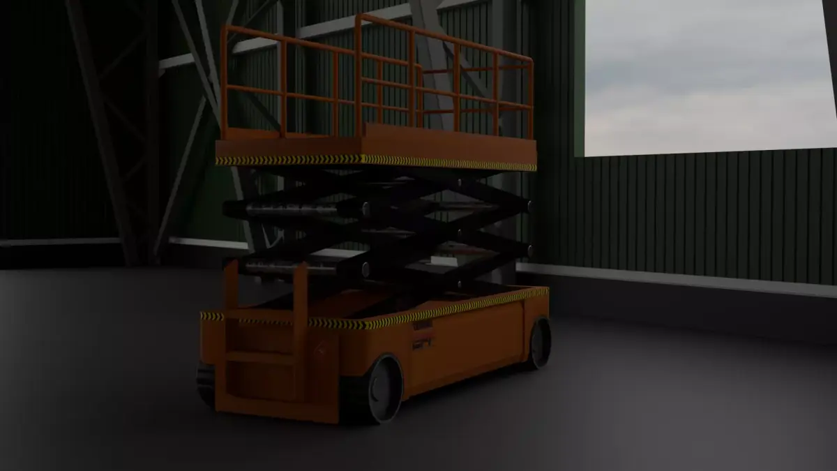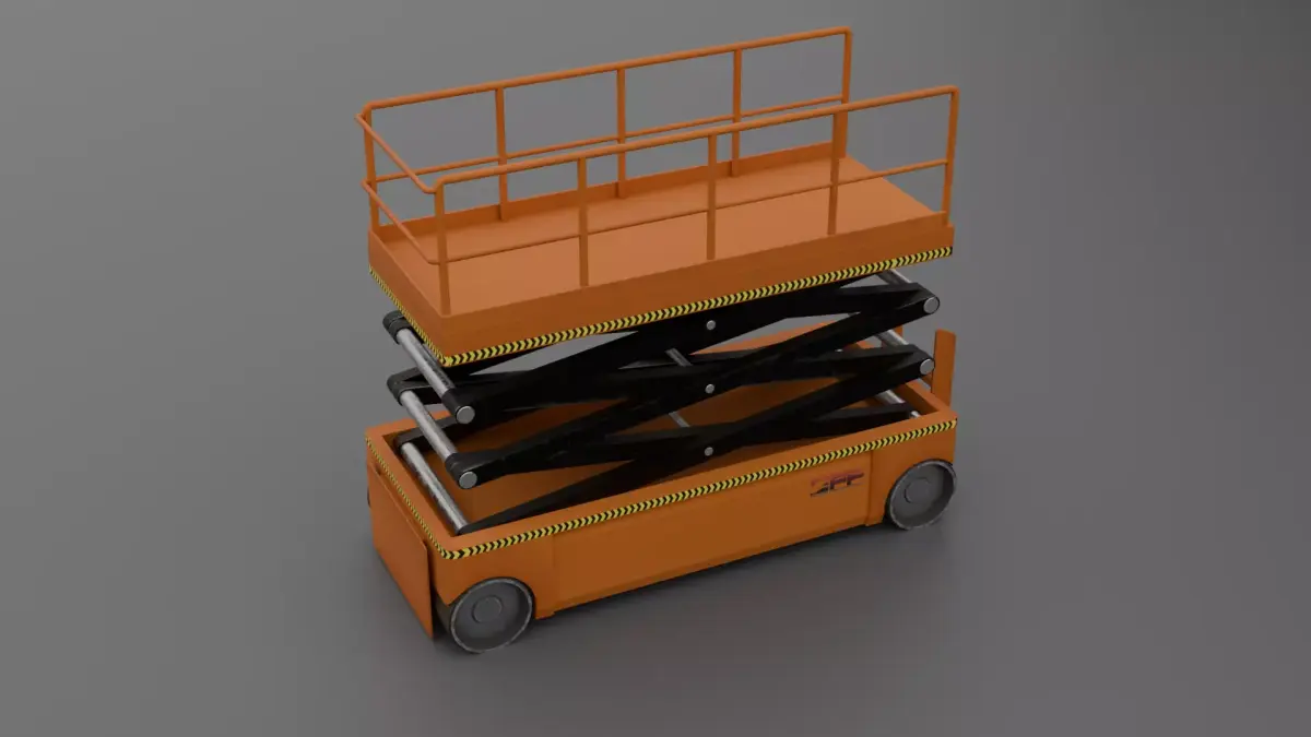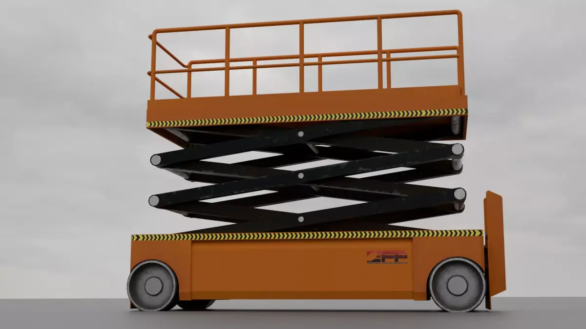 - 3D model of an industrial-type scissor lift The model is made in orange with black and yellow warning markings. The lifting mechanism consists of cross metal beams and is designed to lift people or equipment to a height during construction and repair work. Suitable for visualizations, games, VR/AR projects, and construction simulators.